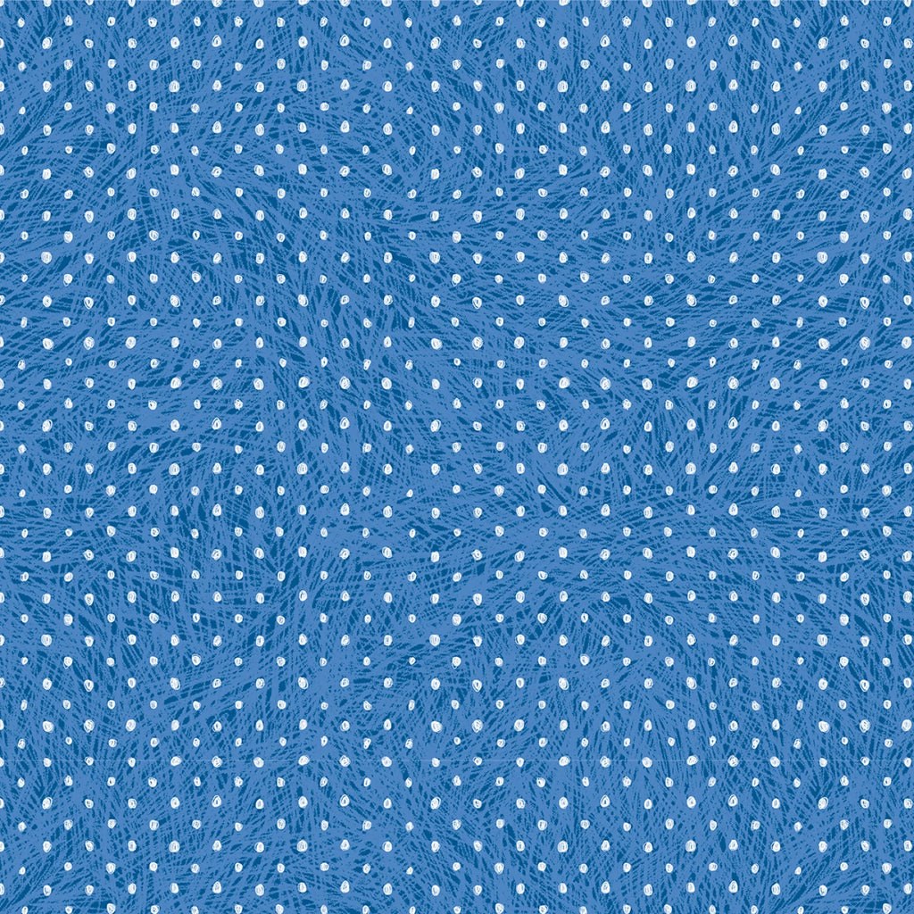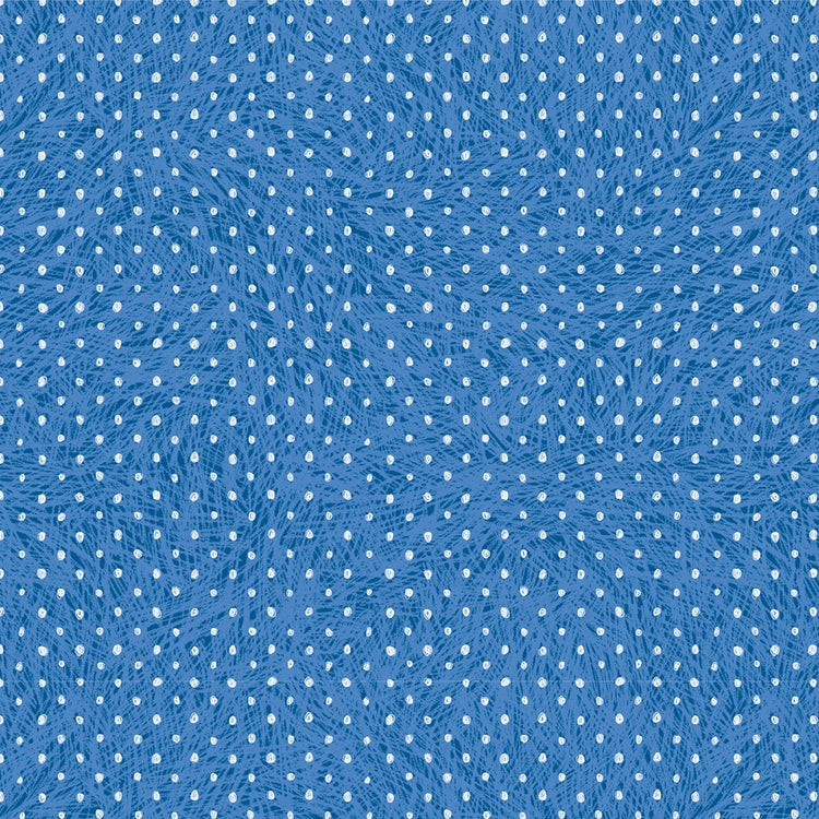 This fabric features a charming blue background adorned with a playful pattern of small white pin dots, creating a lively and textured appearance. The design is reminiscent of a field of tiny flowers or bubbles, giving it a whimsical and delightful feel. Perfect for crafting projects that require a touch of fun and elegance, this fabric's soft cotton texture makes it ideal for a variety of uses, from apparel to home decor.