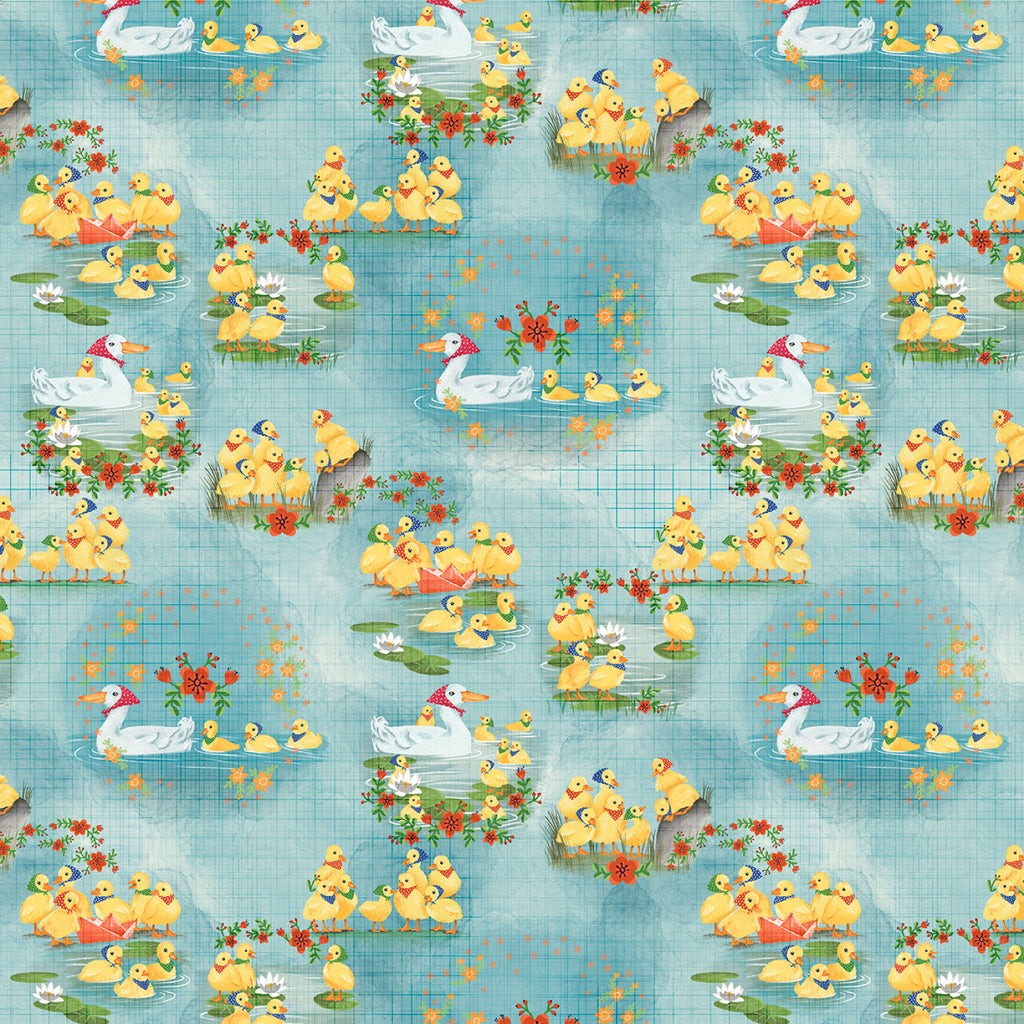 This charming fabric features a delightful pattern of mama and baby ducklings frolicking in a serene pond, surrounded by vibrant flowers and lily pads. The design is set against a soft blue background, creating a peaceful and playful scene that is perfect for a variety of crafting projects. The ducklings are depicted in various poses, some swimming, others nestled together, adding a dynamic and heartwarming touch to the fabric.