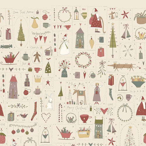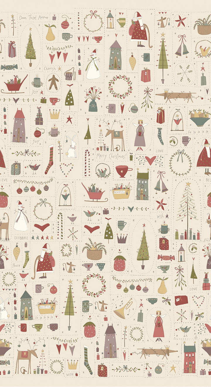 This 100% cotton print features charming illustrations of the Christmas season...reindeer, Santa, snowmen, angels, and more on a cream background.
