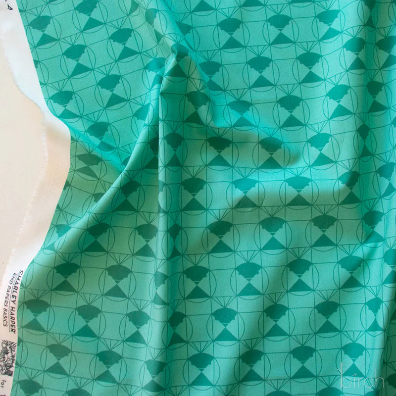 This organic cotton print showcases Charley Harper’s signature chickadee motif in a crisp geometric repeat, colored in a vibrant lagoon teal with deep green accents. The bold, aquatic-inspired palette gives this design a fresh, modern energy while still functioning as a reliable blender with subtle movement. Its small, orderly scale adds structure to patchwork, borders, linings, and bag making without overwhelming adjacent prints. A lively, contemporary colorway that brings a splash of Harper’s nature-inspired charm to any sewing project.