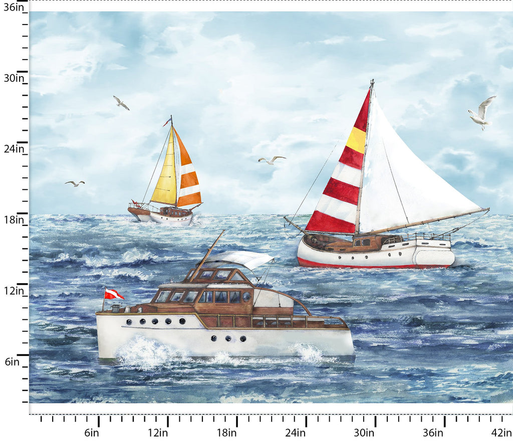 This 36" x 43" panel from Fair Winds & Following Seas features a scenic ocean view with classic motorboats and sailboats gliding across choppy blue waves. Pops of red, yellow, and orange sails brighten the painterly seascape, while soaring gulls complete the coastal vibe. Digitally printed on 100% cotton, this panel is perfect for creating wall hangings, pillows, or the centerpiece of a nautical quilt.