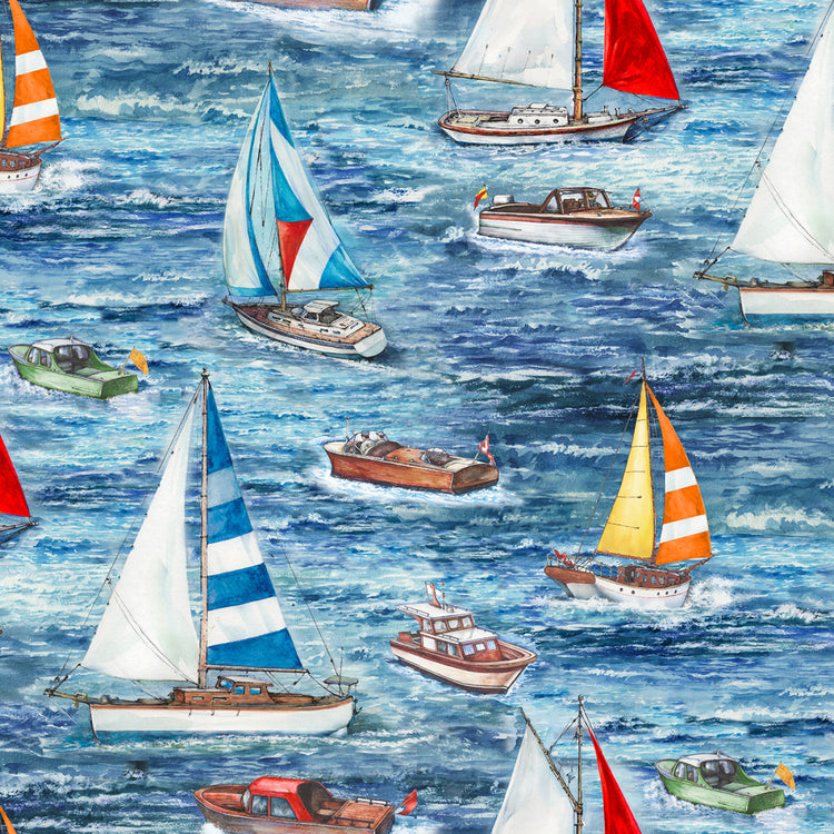 This scenic print from Fair Winds & Following Seas features sailboats and motorboats drifting across painterly blue waves. Pops of red, orange, yellow, and green bring vibrant contrast to the rich ocean backdrop, creating a design that feels fresh and full of movement. Perfect for nautical quilts, coastal home décor, or summer bags, this digitally printed 100% cotton fabric captures the timeless beauty of life on the water.