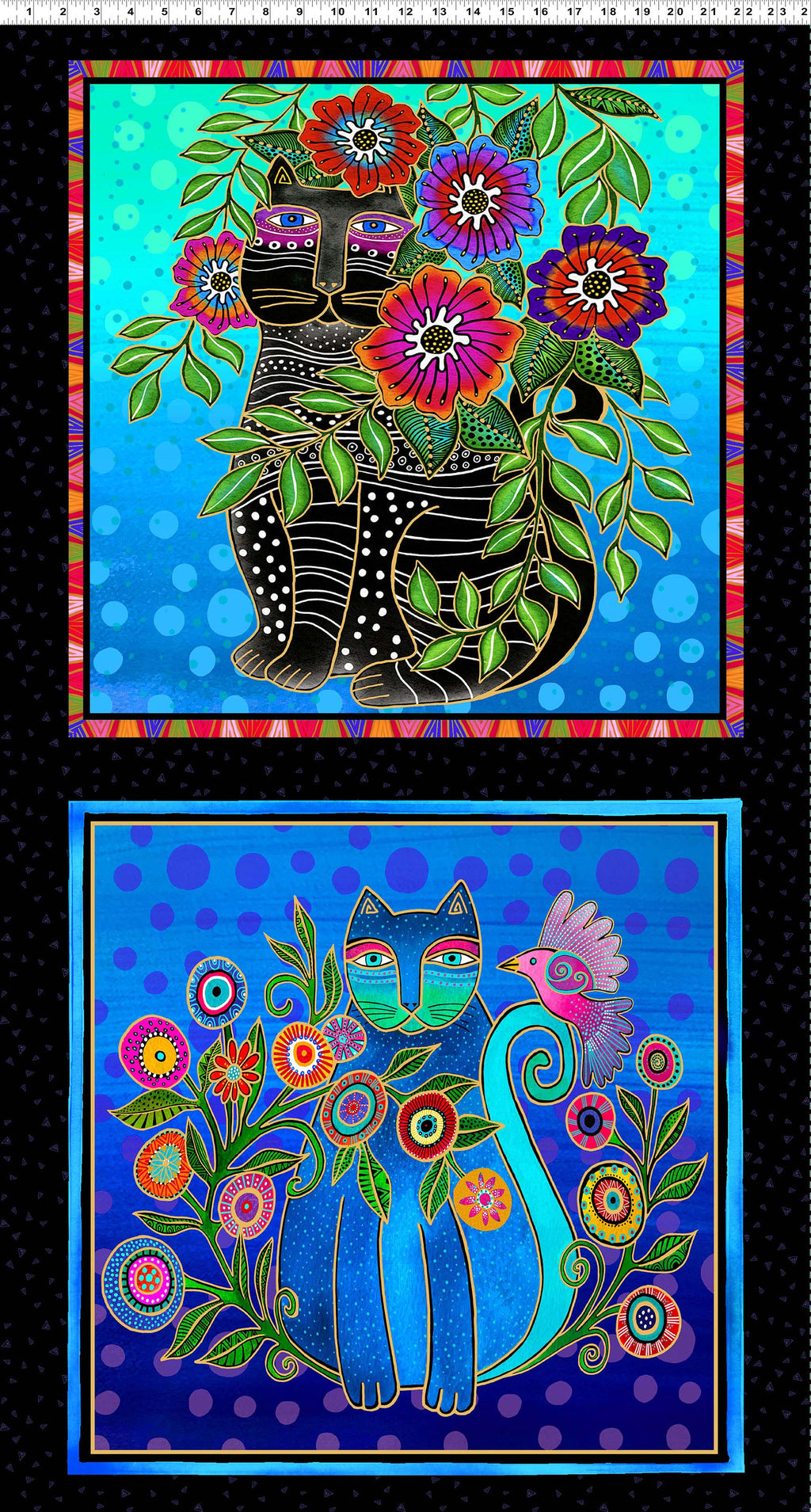 This pillow panel from the Fantasticats collection by Laurel Burch features two bold and whimsical square cat designs, brought to life with vibrant jewel tones and shimmering metallic accents. Each cat is adorned with intricate patterns, florals, and fantastical details, showcasing Laurel Burch's iconic artistic style.