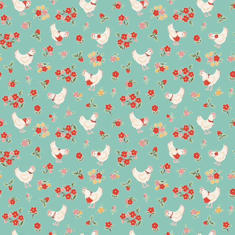 This 100% cotton print features charming chickens, strawberries, and tiny florals scattered across a fresh teal background. It’s the playful novelty print in Farmhouse Fancy, adding a cheerful farmhouse touch to quilts, table runners, bags, and seasonal spring sewing. A standout coordinate that pairs beautifully with the florals and grids in the collection.