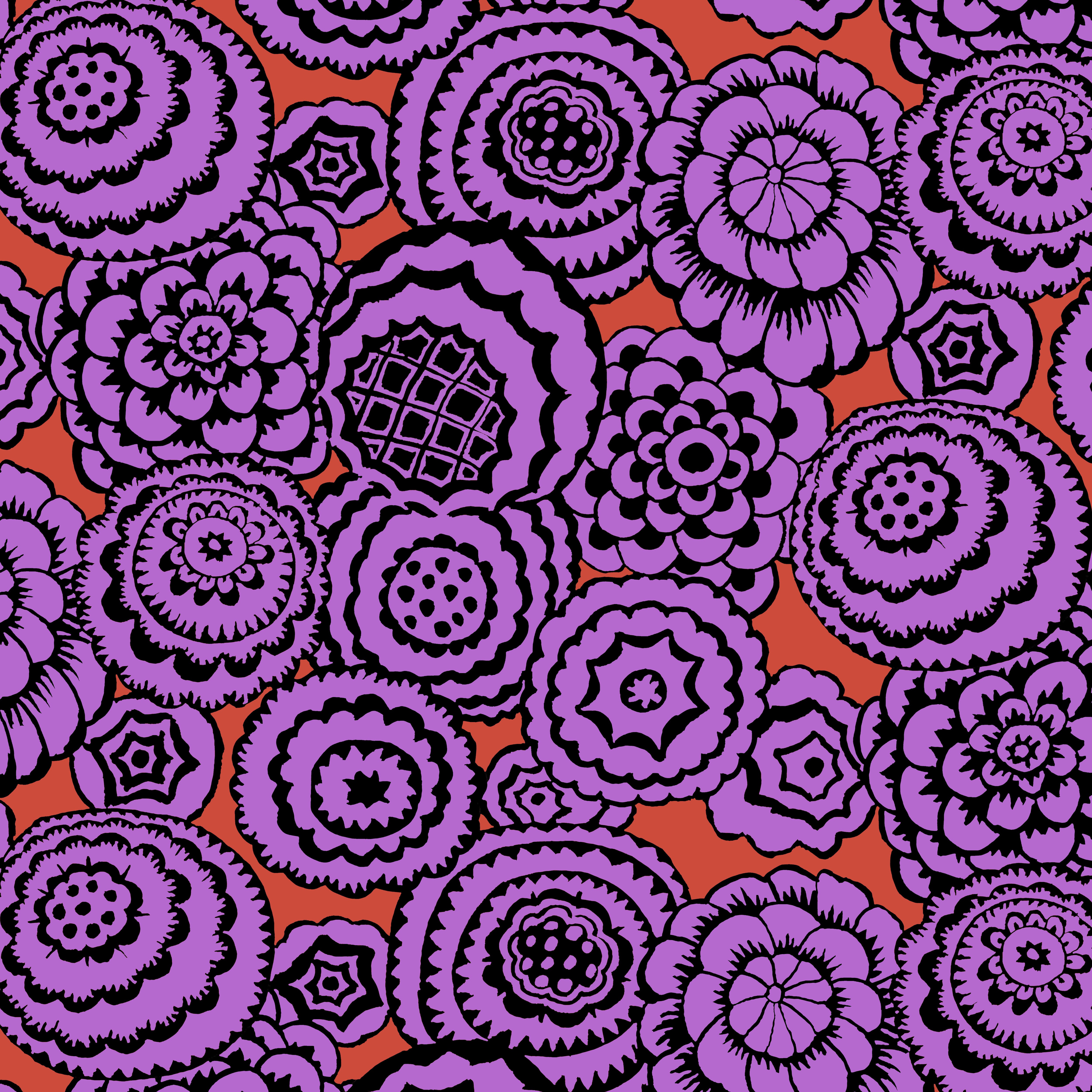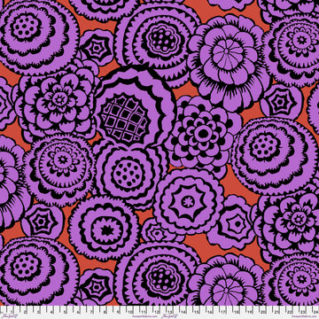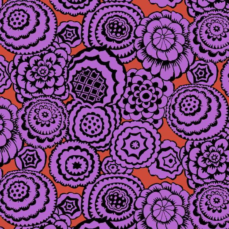 This print features an art deco-inspired design in deep, rich tones of black and purple with a burnt orange background. This fabric's intricate patterns and bold color palette make it ideal for adding a touch of dramatic elegance and sophistication to quilting and sewing projects.