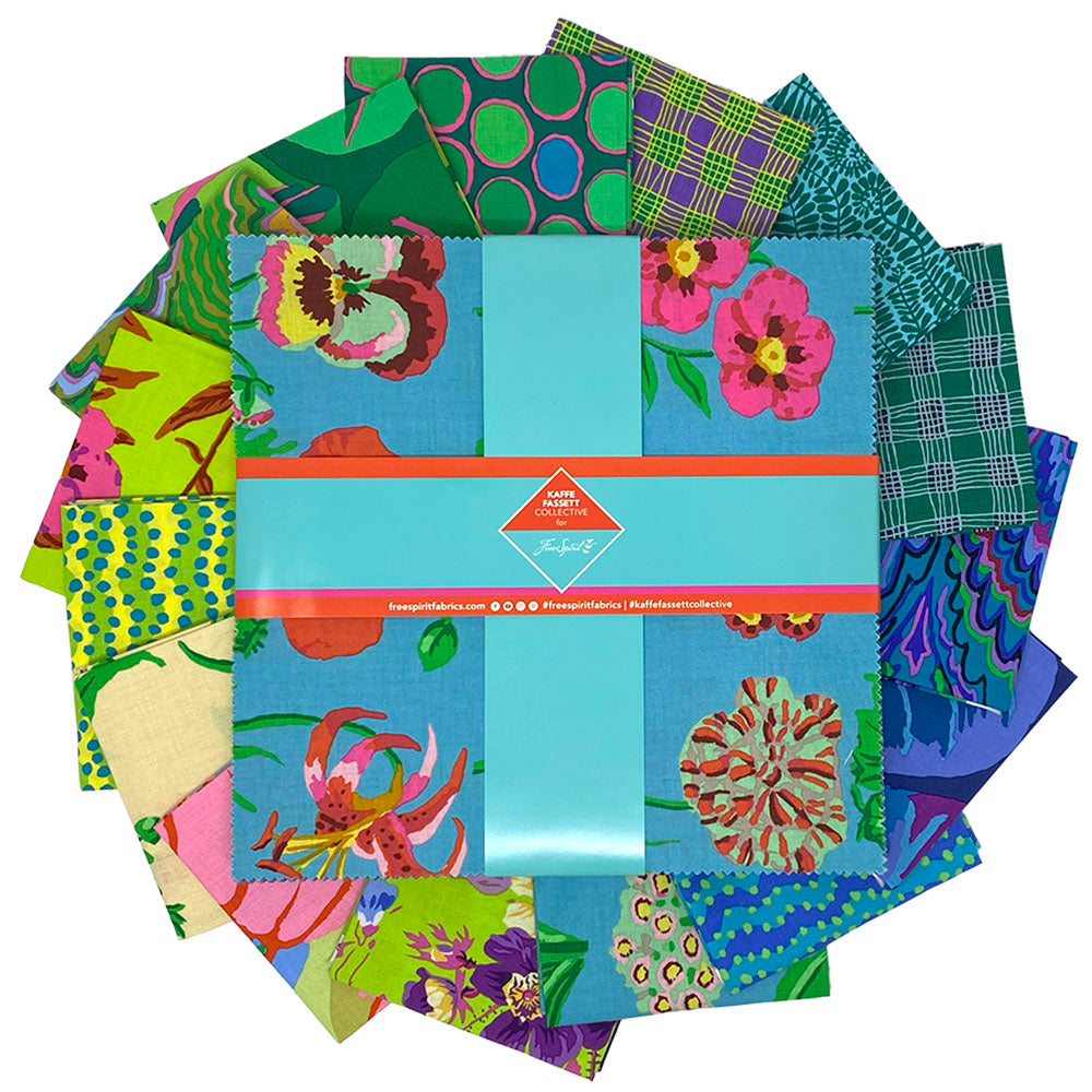 This precut bundle includes 42 squares (10" x 10") from the Cool colorway in the February 2025 Kaffe Fassett Collection for Free Spirit. Includes duplicates.