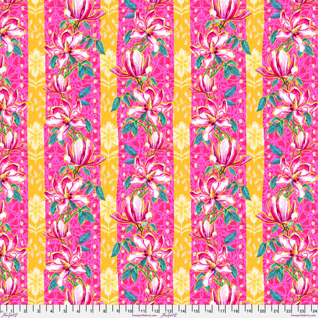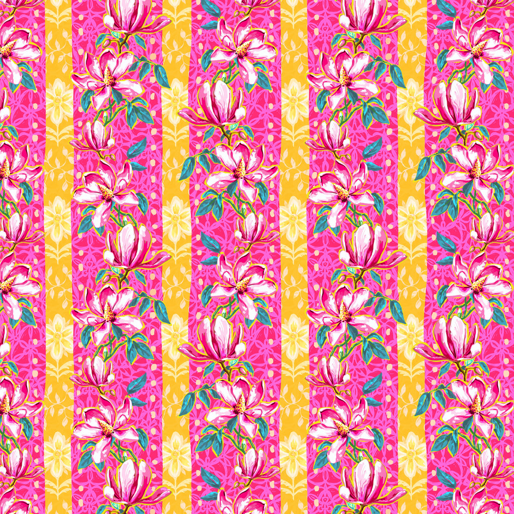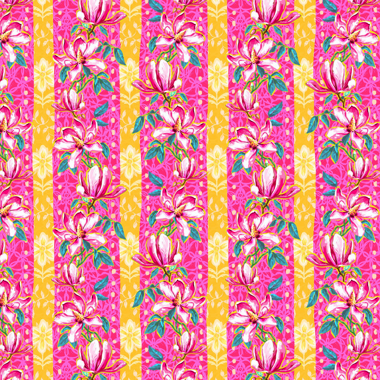 Magnolias – Pink is printed on 100% cotton and features graceful pink magnolia blossoms climbing across vertical bands of vibrant pink and golden yellow. The expressive florals are layered over decorative patterning, creating a lively sense of movement while keeping the focus on the blooms. This bold floral print works beautifully as a feature fabric in quilts, borders, and large blocks, and brings warmth and personality to bags, pillows, and home décor projects.