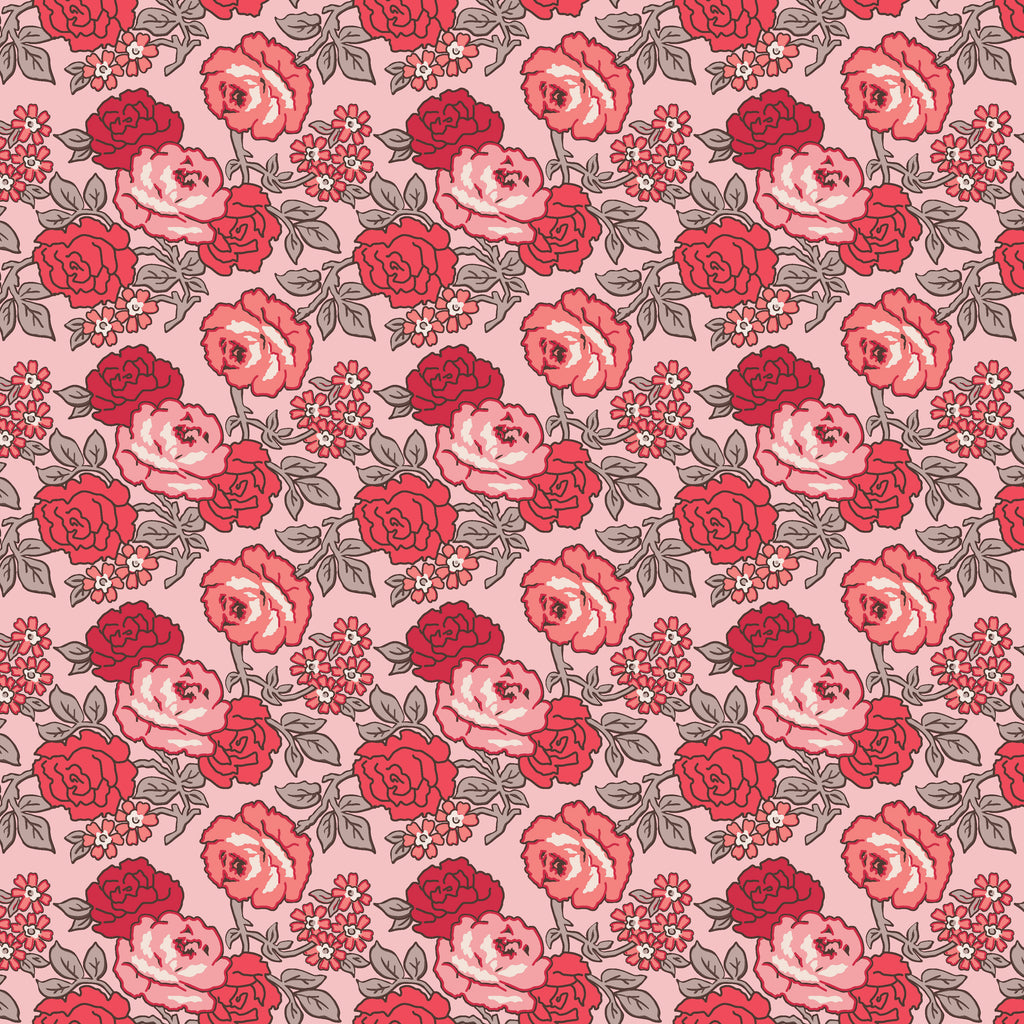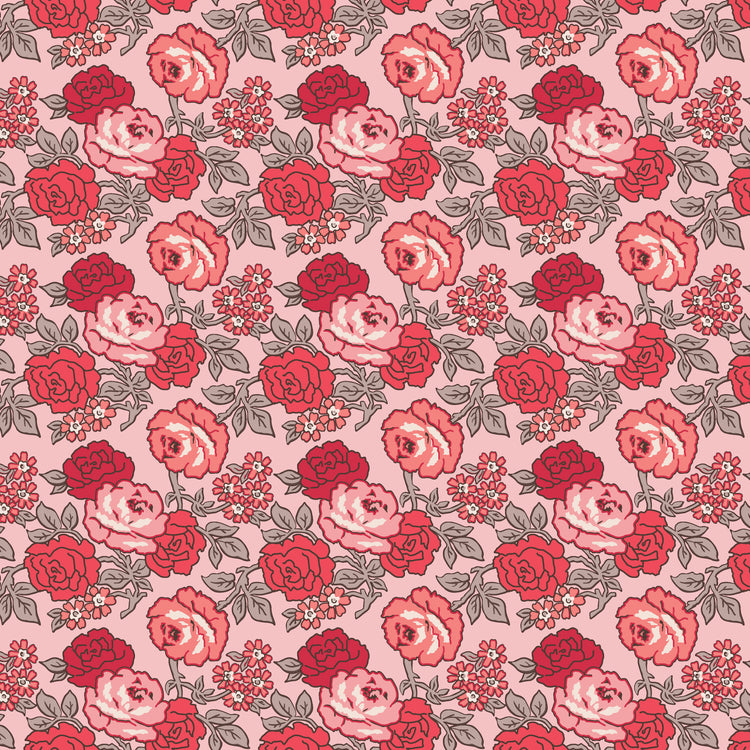 This fabric from Lori Holt’s Flea Market collection features her signature rose print, set against a soft pink background. The charming vintage-inspired roses bring a nostalgic, cottage feel that pairs beautifully with both her blenders and larger florals. Perfect for adding a romantic touch to quilts, table runners, bags, and home décor, this print works well as a feature fabric or mixed into scrappy projects for a pop of color and sweetness.