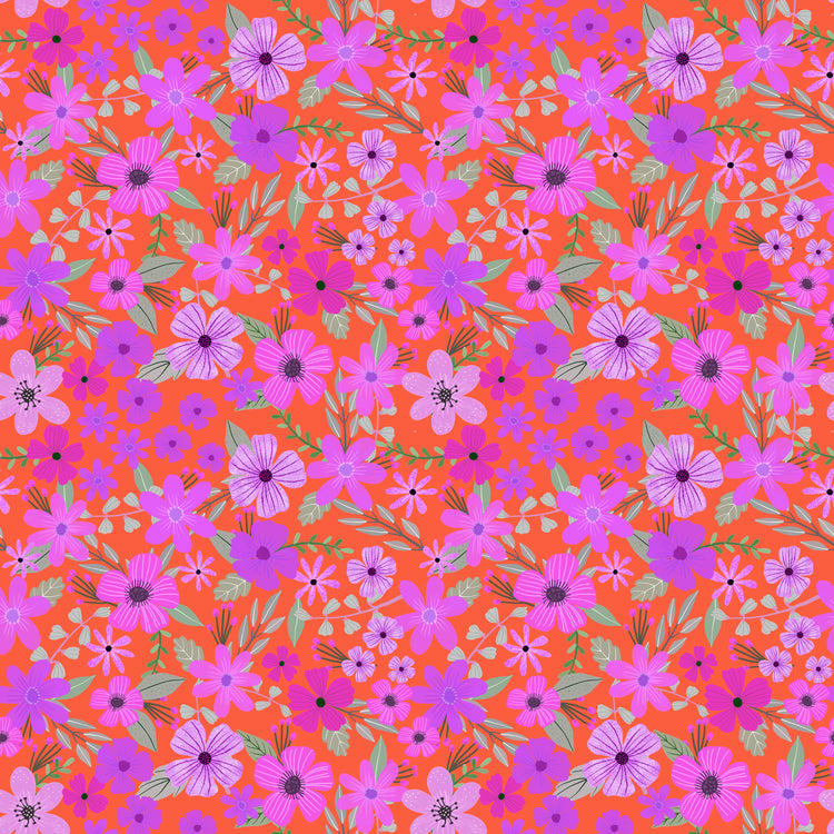 Blossom Bonanza – Strawberry from the Floral Fiesta collection by Mia Charro for FreeSpirit features a lively mix of bold pink, purple, and magenta blooms scattered across a bright strawberry-orange background. Printed on 100% cotton quilting fabric, this energetic floral brings a fresh, modern feel and is perfect for statement quilts, home décor, and colorful sewing projects.
