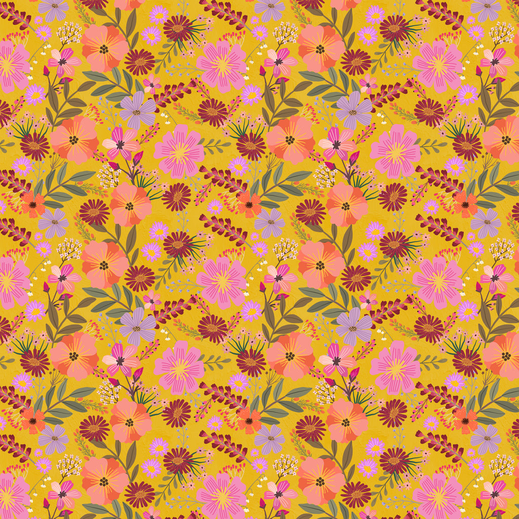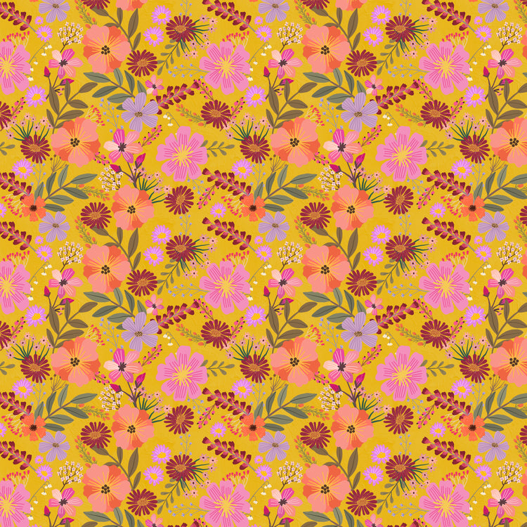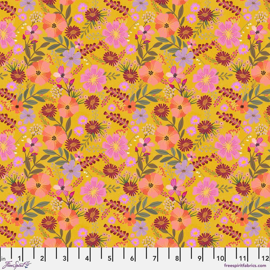 Daisy Delight – Marigold from the Floral Fiesta collection by Mia Charro for FreeSpirit features a cheerful mix of blooming florals in pink, coral, and berry tones scattered across a warm marigold background. Printed on 100% cotton quilting fabric, this lively print brings a bright, sunny feel to quilts, home décor, and colorful sewing projects.