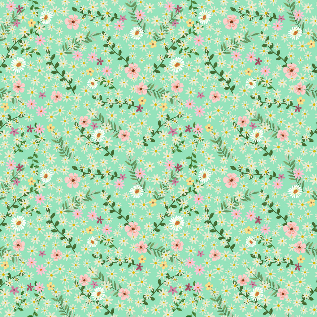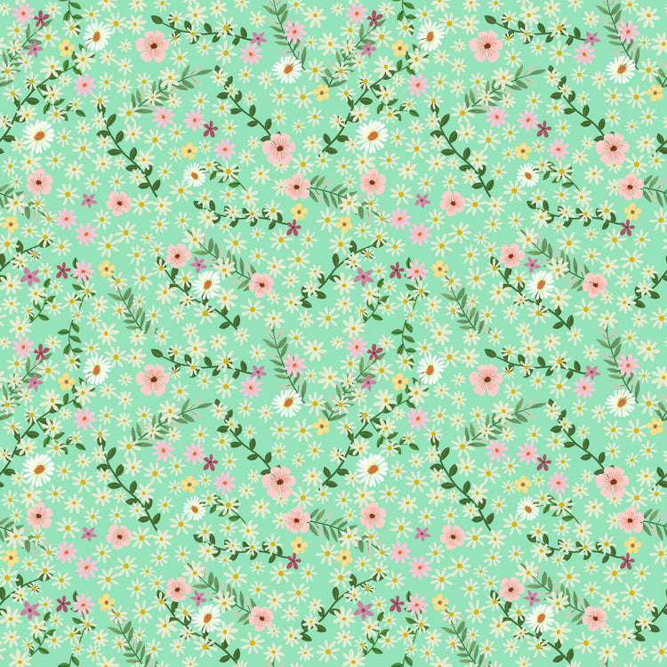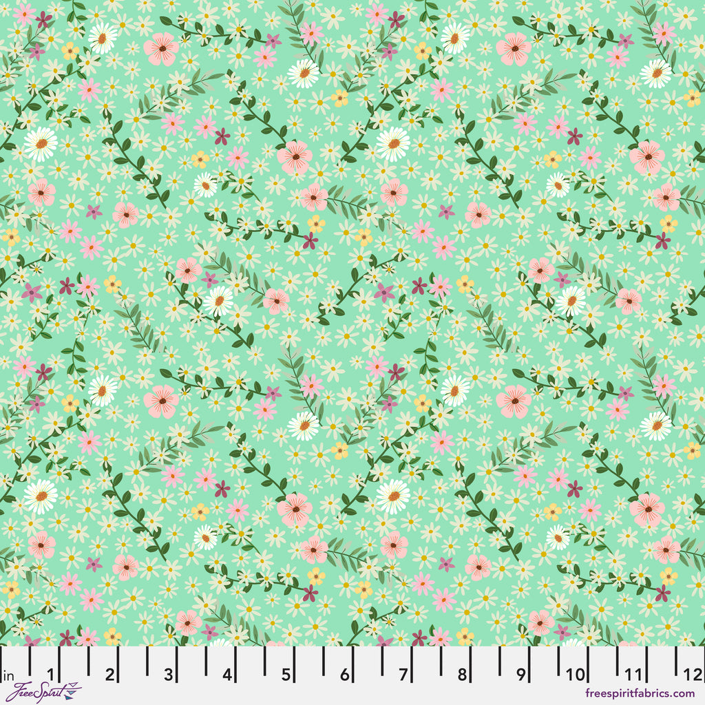 Happy Petals – Mint from the Floral Fiesta collection by Mia Charro for FreeSpirit features delicate daisies and soft floral sprigs scattered across a fresh mint background. Printed on 100% cotton quilting fabric, this light and airy design adds gentle movement and works beautifully for quilts, nursery projects, and fresh spring sewing.