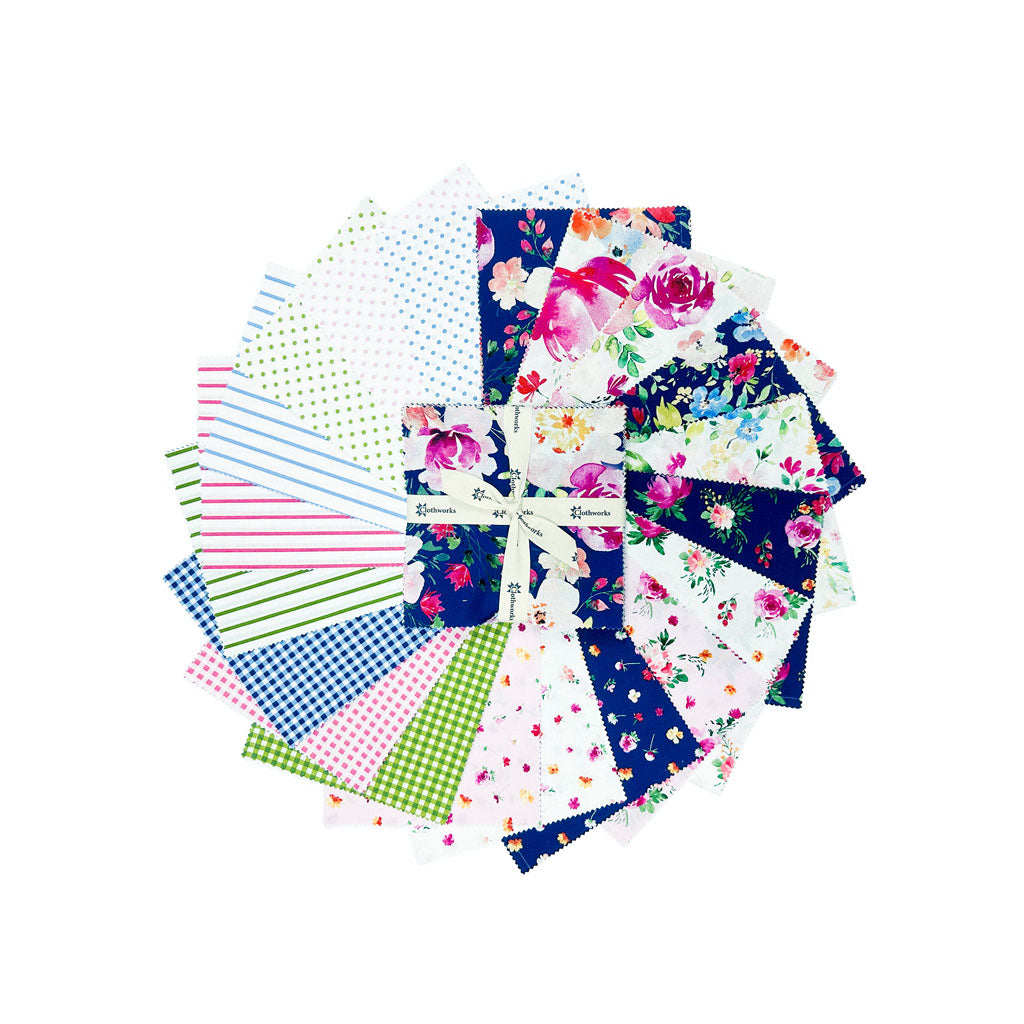This precut bundle includes 42 individual squares (5" x 5") from the Flourish collection by Heatherlee Chan for Clothworks. Includes duplicates.