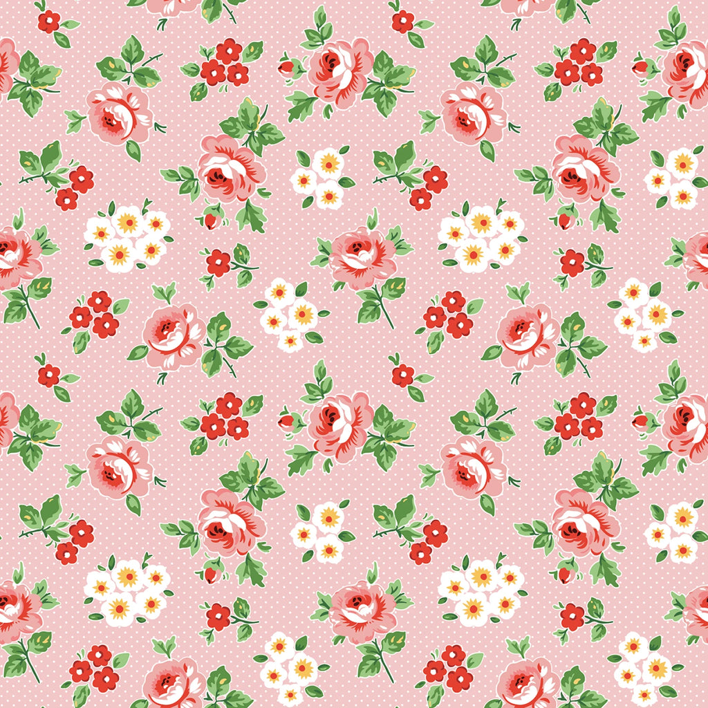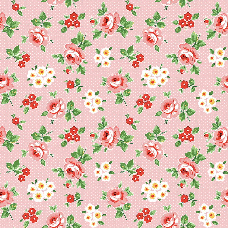 Clusters of soft pink and red flowers are scattered across a blush background with tiny white dots, giving this print a sweet, vintage cottage feel. Printed on 100% quilting cotton, the medium-scale florals make it a lovely choice for both feature pieces and supporting coordinates in quilts. It blends beautifully with the rest of the Flower Market collection, adding warmth and a classic floral touch. Great for quilts, pillow shams, aprons, dresses, bags, and charming home décor projects.
