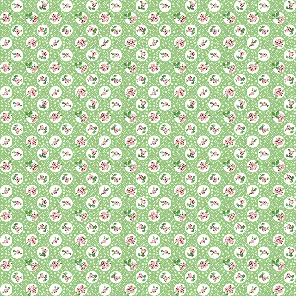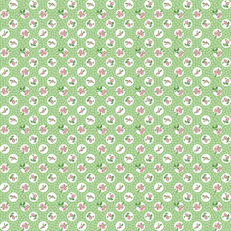 This small-scale print features tiny floral sprigs nestled inside scattered white dot circles on a soft green background. Printed on 100% quilting cotton, it has the feel of a sweet, vintage blender that’s easy to use in patchwork, borders, bindings, and sashing. It coordinates beautifully with the larger florals and focal prints in the Flower Market collection, adding gentle color and texture without overwhelming.