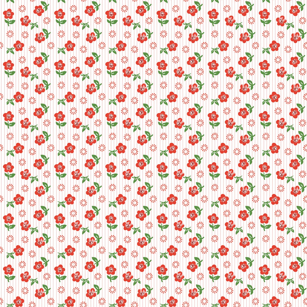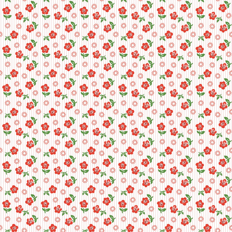 This print features small red blossoms arranged along soft vertical stripes, giving it a sweet, classic look with just the right amount of structure. Printed on 100% quilting cotton, the scale makes it easy to use in piecing and sashings, and the stripe adds a nice visual rhythm in quilt blocks. It coordinates beautifully with the other florals in the Flower Market collection while also standing on its own for bags, pillowcases, aprons, and garments.