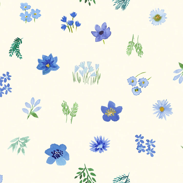 This enchanting fabric features a delicate pattern of dancing flowers in various shades of blue, set against a soft cream background. The design includes an array of floral elements from large, vibrant blue blossoms to smaller, daisy-like flowers, interspersed with sprigs of green leaves. This charming floral motif is perfect for creating light, airy garments or home decor items, bringing a touch of garden freshness to any project.