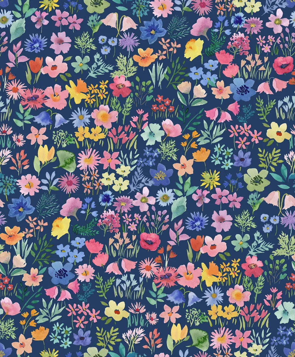 This fabric by Bluebellgray features a lush, expressive watercolor floral design set against a deep navy background. Painted in Bluebellgray’s signature style, the blossoms bloom in vibrant shades of pink, blue, green, and gold, evoking the look of a joyful spring or summer garden. This fabric brings an artistic, painterly touch to quilts, home décor, or apparel projects. Printed on soft 100% cotton, it’s a beautiful choice for anyone who loves florals with a modern fine art twist.