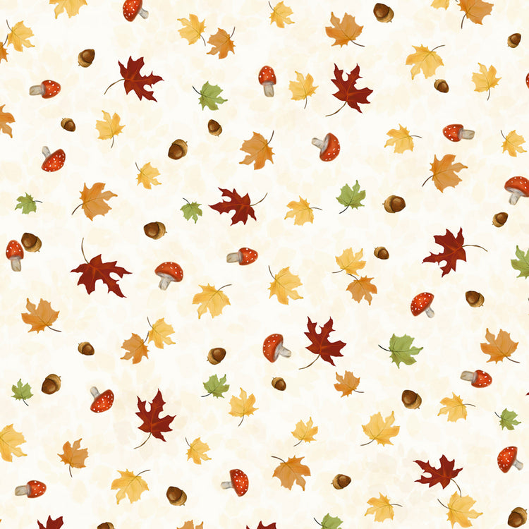 This charming fabric features a delightful ditzy leaf toss design, scattered with an array of autumnal elements including vibrant red, orange, and yellow leaves, alongside playful mushrooms and acorns. The light background enhances the vividness of the scattered motifs, making it perfect for projects that need a touch of fall's warmth and whimsy.