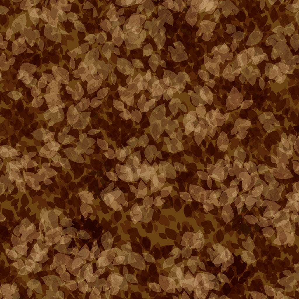 This fabric features a sophisticated tonal leaf blender design, where leaves in various shades of brown are scattered across a darker brown background, creating a rich, layered effect ideal for both subtle and bold projects. The pattern provides a natural, organic feel, making it perfect for quilting, apparel, or home decor, blending seamlessly into any setting.