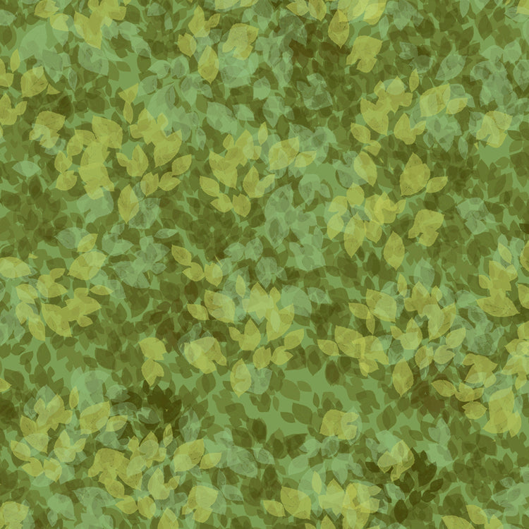 This fabric features a captivating tonal leaf blender design, where leaves in varying shades of green and yellow are layered to create a lush, natural look. The pattern is subtle yet intricate, providing a versatile backdrop for a variety of sewing projects, from quilting to apparel, enhancing any project with a touch of nature's tranquility.
