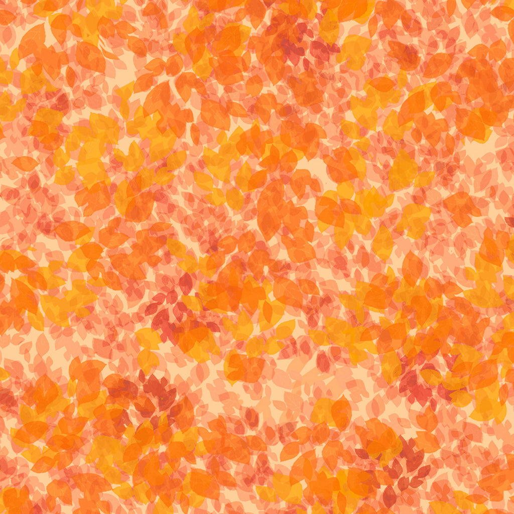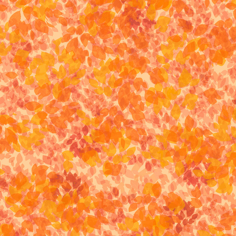 This fabric features a vibrant tonal leaf blender design, showcasing an array of autumnal hues from soft peach to rich orange. The leaves are scattered in a way that creates a harmonious blend, ideal for projects that require a touch of nature's beauty with a modern twist. The fabric's soft texture and excellent drape make it suitable for a variety of applications, from apparel to home decor.
