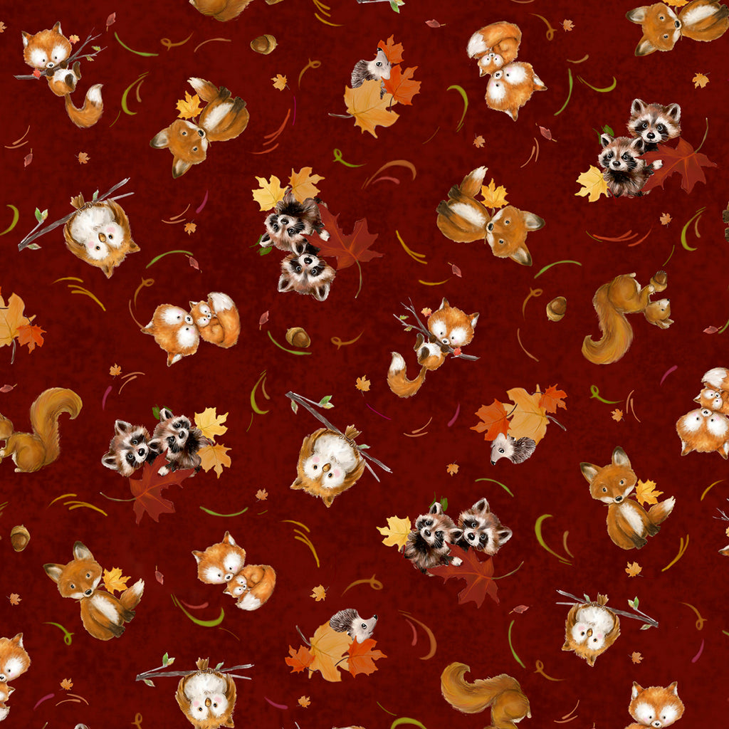 This enchanting fabric features a delightful array of forest creatures, including foxes, raccoons, squirrels, and owls, all set against a rich red background. The design is playful and whimsical, with the animals appearing to frolic among autumn leaves and acorns, creating a warm and inviting scene perfect for crafting projects that evoke the charm of a forest in fall.