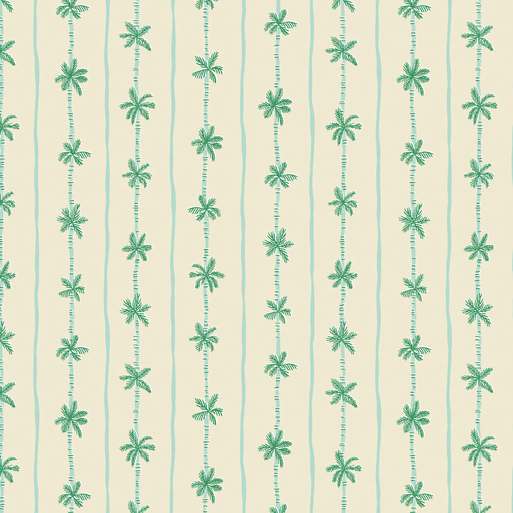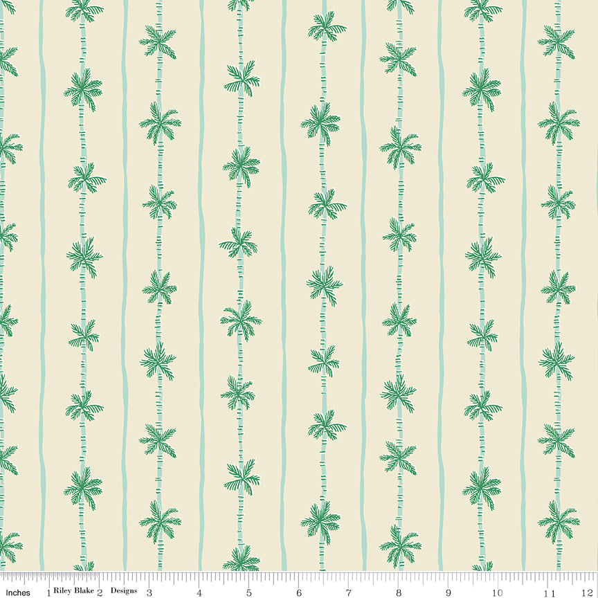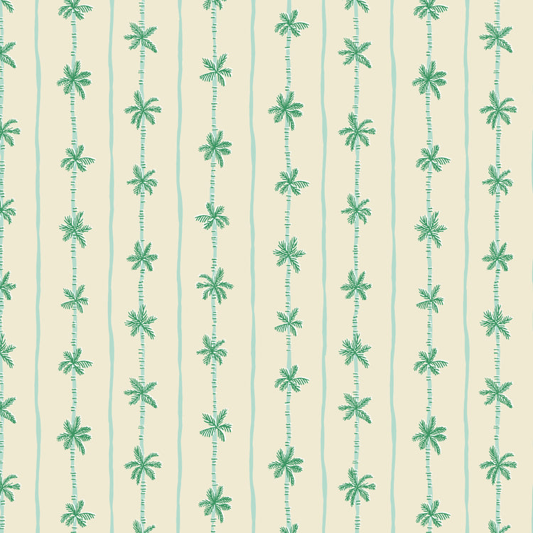 This delightful fabric features a charming design of vertical palm tree stripes in a refreshing shade of green against a soft sand dollar background. The pattern evokes a serene tropical vibe, perfect for creating breezy summer garments or home decor that brings a touch of paradise with a vacation-like atmosphere. The fabric's lightweight and breathable nature, thanks to its 100% cotton composition, ensures comfort and ease of care.