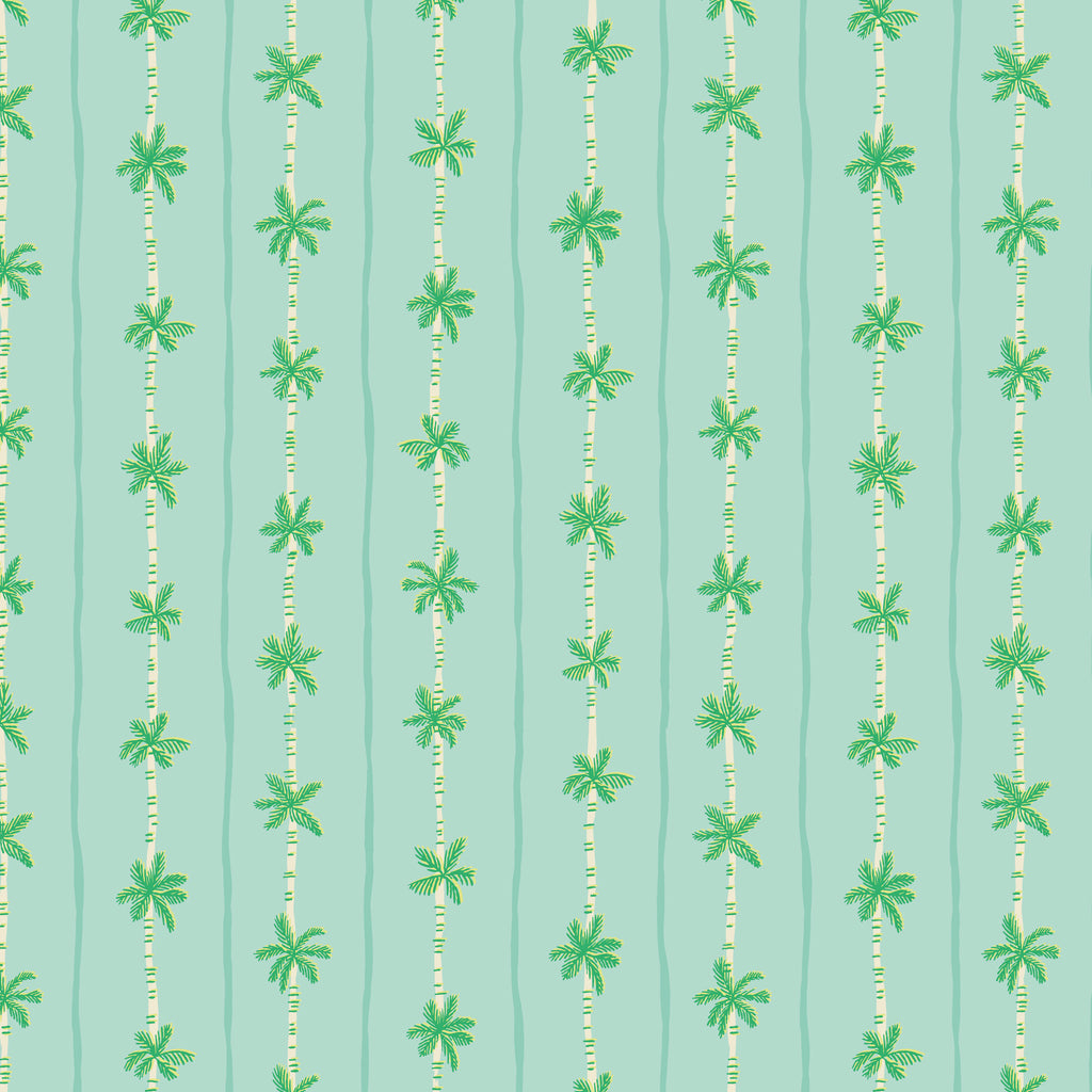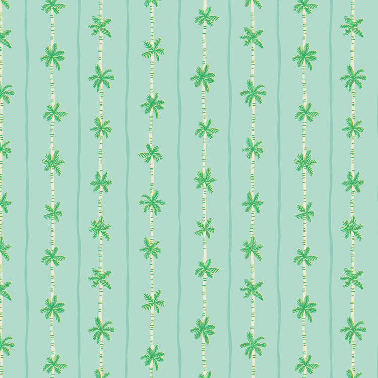 This vibrant fabric features a delightful pattern of vertical palm tree stripes set against a soft, pastel green background. The design is playful and tropical, with each palm tree meticulously illustrated to create a sense of depth and continuity, perfect for adding a touch of paradise to any project. The fabric's lightweight and breathable nature makes it ideal for a variety of applications, from apparel to home decor.