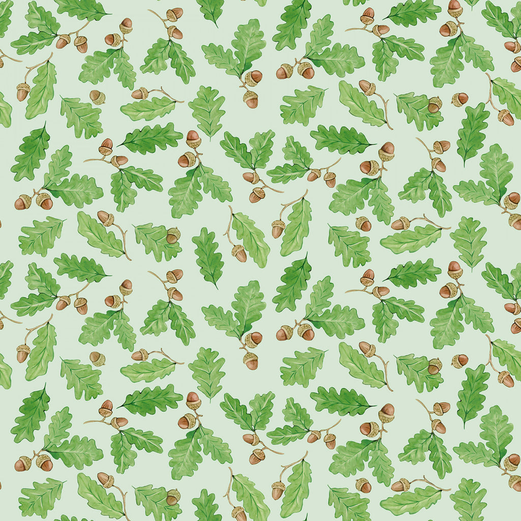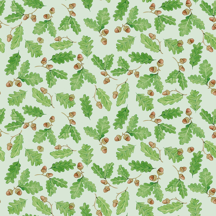This fabric features a charming design of scattered oak leaves and acorns, rendered in vibrant green hues against a soft, pastel background. The pattern evokes a sense of nature's tranquility and is perfect for projects that aim to bring a touch of the outdoors inside. Crafted from high-quality cotton, this fabric is ideal for a variety of sewing projects, from quilting and apparel to home decor, offering both durability and a comfortable feel.