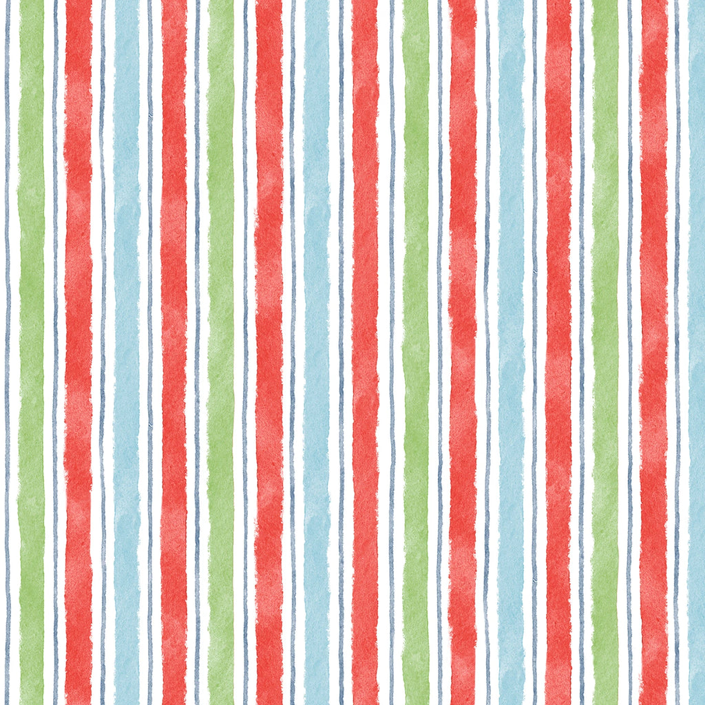 This vibrant fabric features a playful design of vertical stripes in red, blue, and green, set against a crisp white background. The stripes are painted with a watercolor effect, giving the fabric a lively and dynamic appearance, perfect for adding a splash of color to any project. This fabric's cheerful pattern is suitable for a variety of applications, from quilting to apparel.