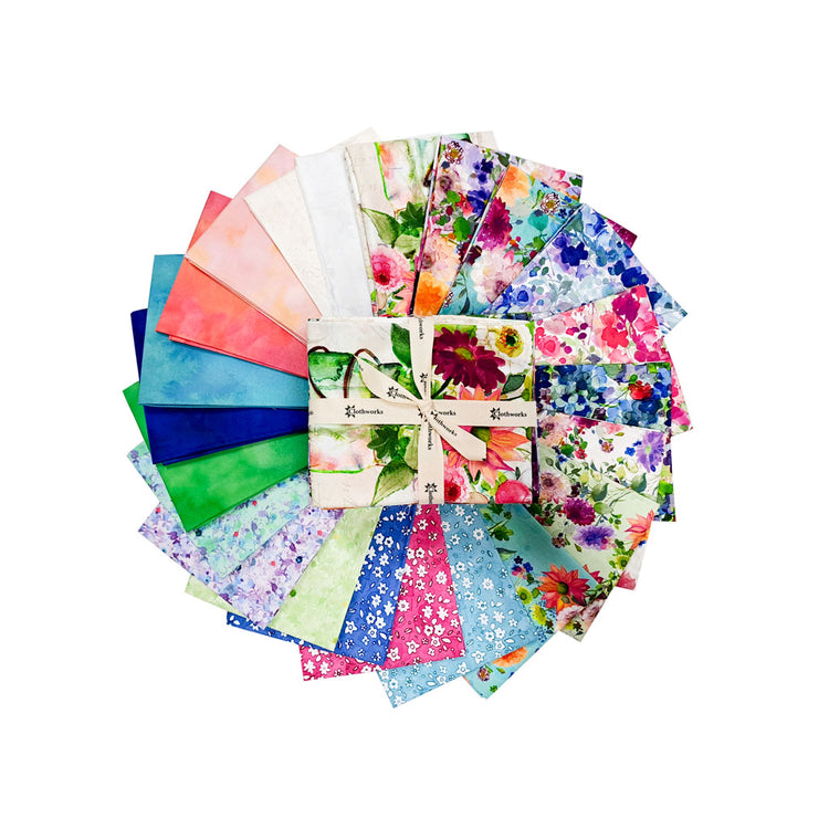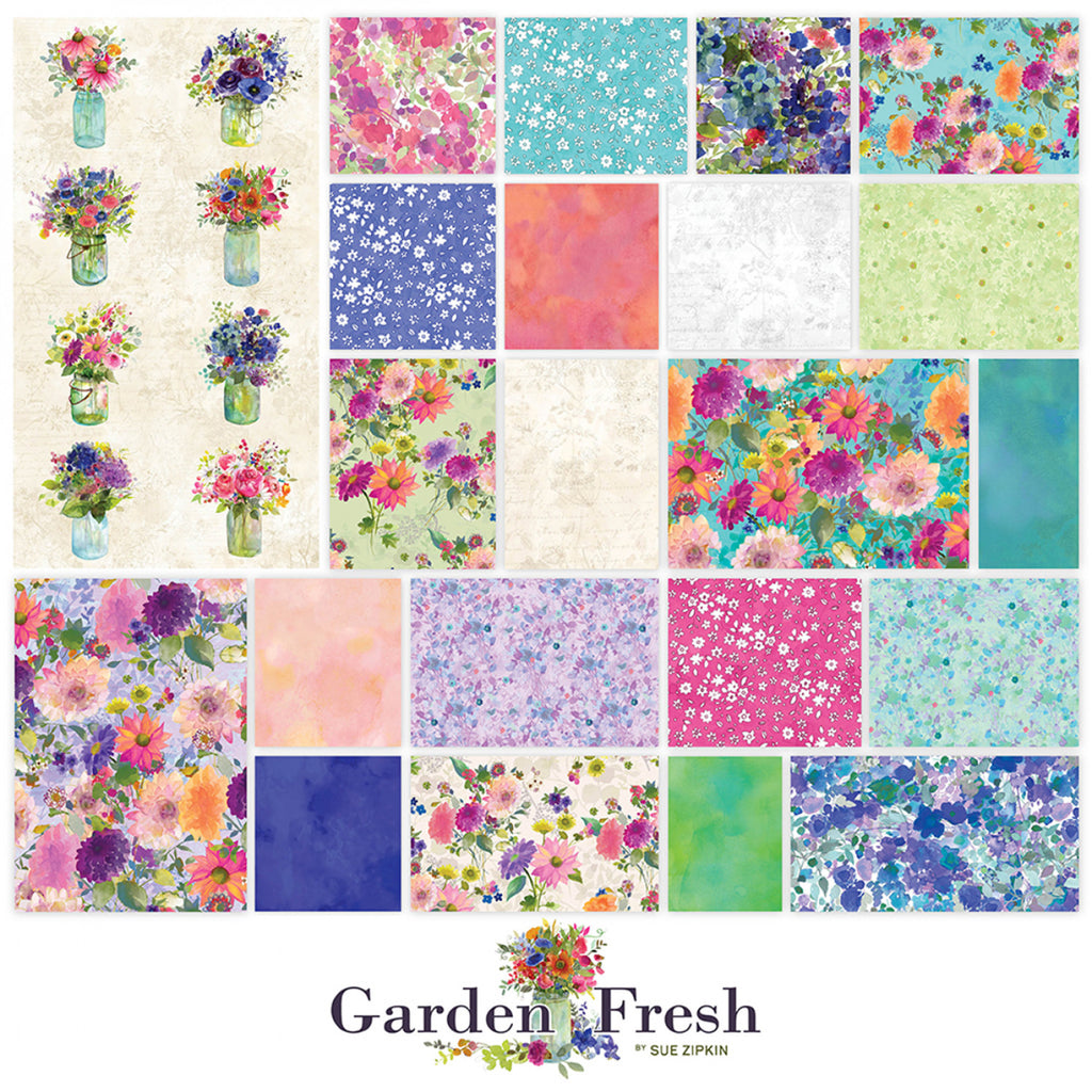 This precut bundle includes 21 fat quarter pieces (18" x 21/22") and one panel (24" x 43/44") from the Garden Fresh collection by Sue Zipkin. No duplicates.
