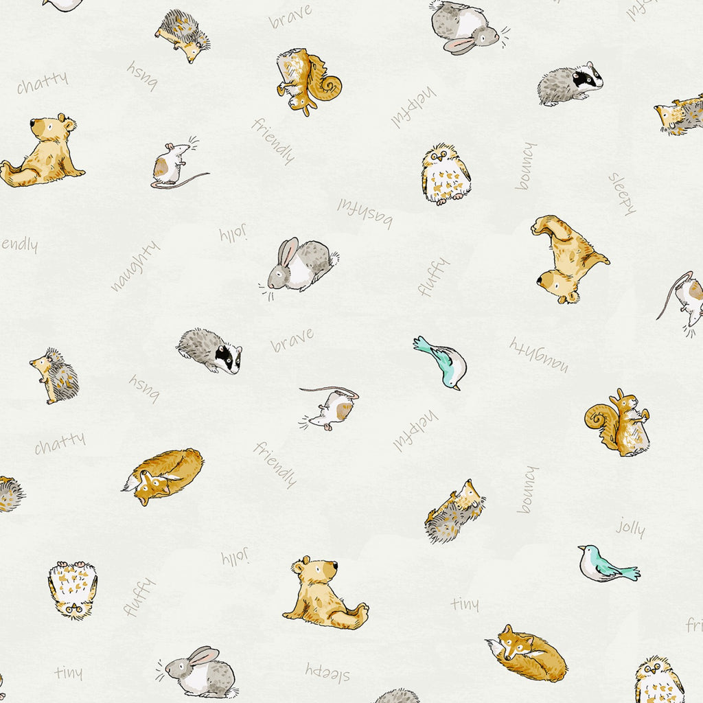 This fabric by Anita Jeram features an adorable scattered print of woodland animals paired with playful personality words like “jolly,” “brave,” and “sleepy.” The light khaki background gives a soft, natural feel, while the animals—rabbits, bears, mice, owls, and more—are illustrated in Anita Jeram’s signature sketchy watercolor style. This whimsical low-volume print is perfect for children’s quilts, baby accessories, or adding a storybook touch to your sewing projects.