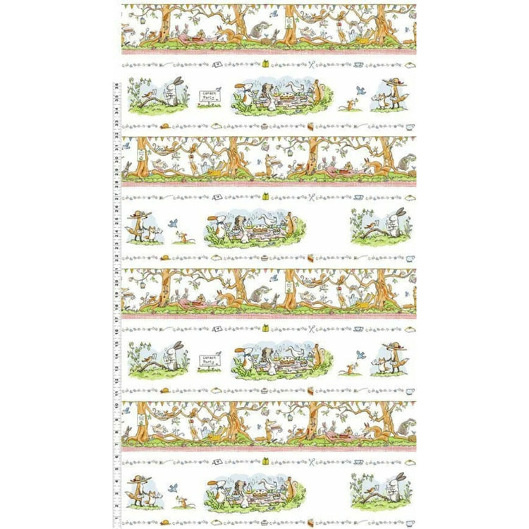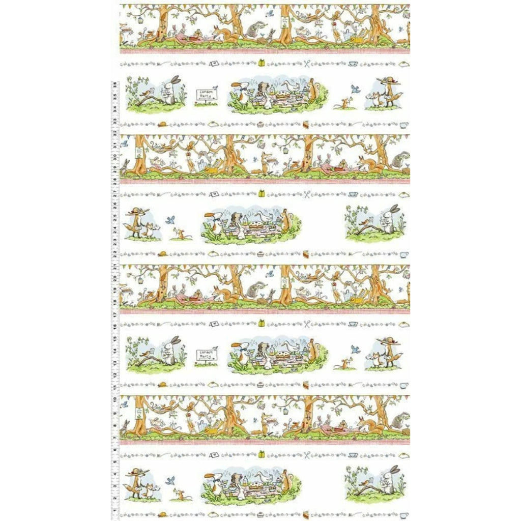 This charming border stripe print features storybook-style scenes of woodland animals enjoying a whimsical garden celebration. Illustrated in Anita Jeram’s signature watercolor style, each stripe alternates between tree-lined gatherings, cheerful critters, and playful floral garlands. The horizontal repeat runs the full width of the fabric, making it perfect for quilt borders, pillowcases, nursery décor, and fussy-cut projects that call for a soft, narrative touch.