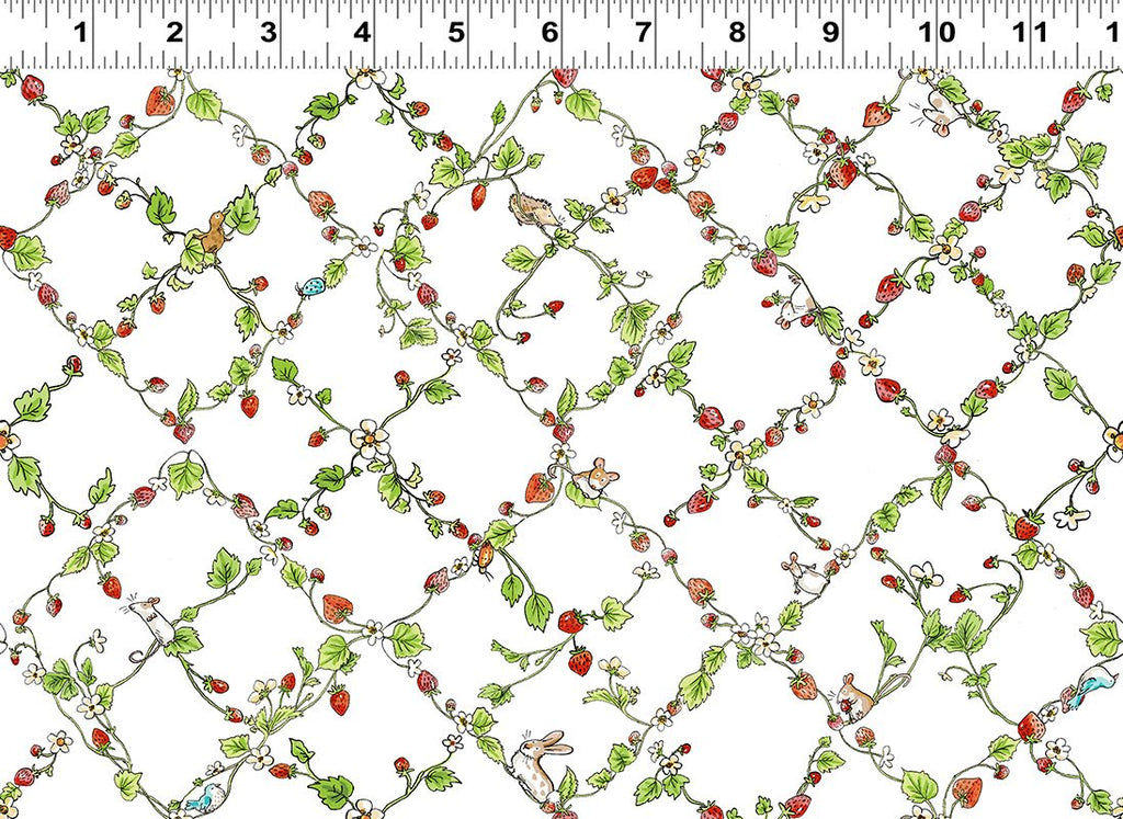 Sweet and playful, Strawberry Vine White by Anita Jeram features delicate strawberry vines climbing in a lattice pattern across a crisp white background. Tiny animals—bunnies, birds, and mice—peek out from the leaves and blossoms, adding a storybook charm to this whimsical print. With soft watercolor detailing and a fresh palette of red, green, and warm neutrals, it’s perfect for baby quilts, summer sewing, and fussy-cutting projects.