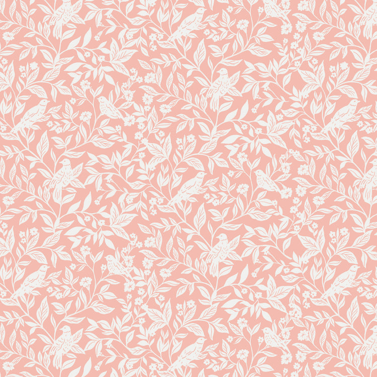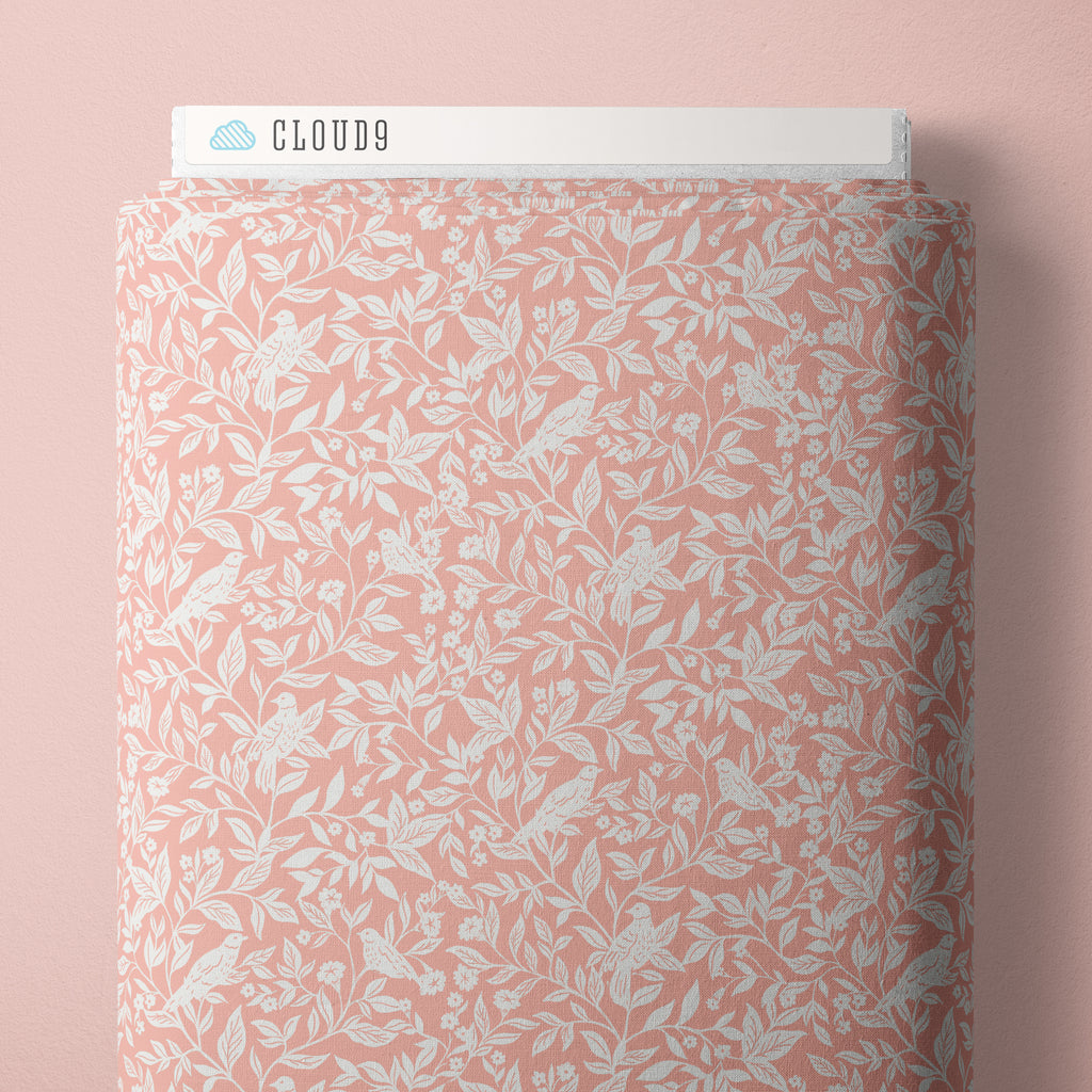 This 100% organic cotton print showcases delicate white songbirds and leafy branches set against a soft peach background. The airy, tonal design has a light and romantic feel, making it ideal for backgrounds, borders, or low-volume accents. A versatile choice for quilts, apparel, and home décor projects, this print adds subtle texture while keeping the look fresh and elegant.
