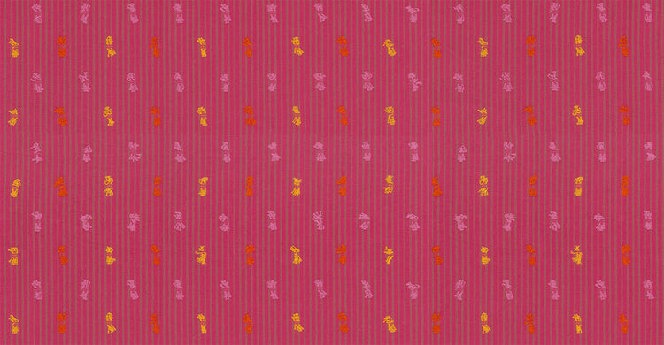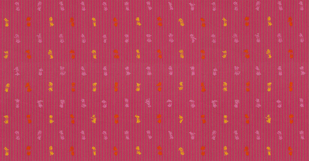 Fine green and red pinstripes serve as a base for playful bundles of woven tassels in pink, orange, and gold. The intricate yarn-dyed construction adds tactile interest and movement to this fabric.