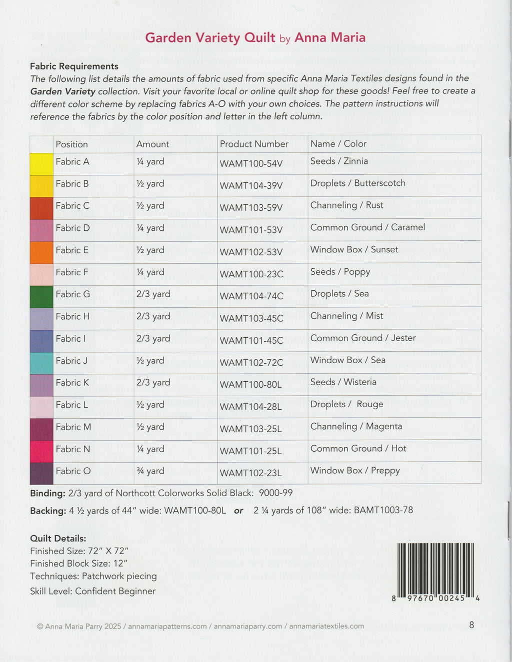 Bursting with cheerful color and playful movement, the Garden Variety quilt is a bold patchwork celebration of Anna Maria’s signature style. Designed at 72" square, this confident beginner-friendly project uses 15 feature prints from the Garden Variety fabric collection by Anna Maria Textiles—a division of Northcott. The striking pinwheel and diamond motifs are brought to life with a rich mix of florals, textures, and yarn-dyed woven plaids for a patchwork look that’s both modern and timeless. Whether hung on the wall or draped across a bed or sofa, this quilt brings a lush, joyful energy to any space.