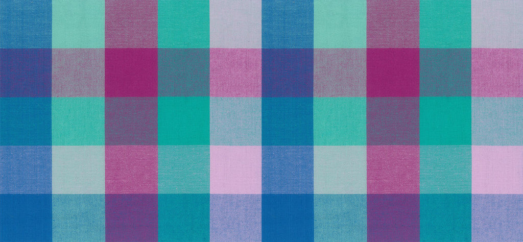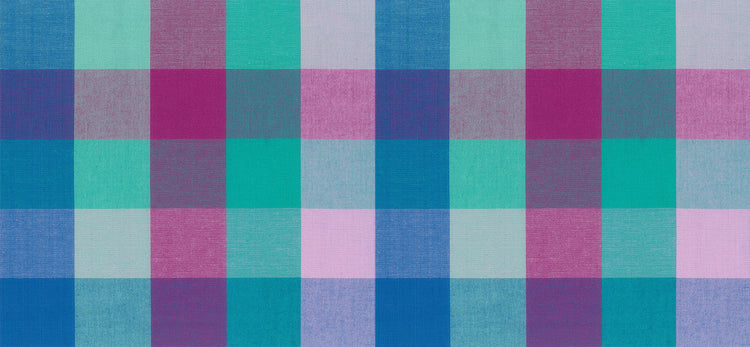 Crisp shades of aqua, violet, turquoise, and seafoam are woven into a bold block plaid. The yarn-dyed threads add dimension and texture, making this a striking yet cohesive option for color-focused projects.