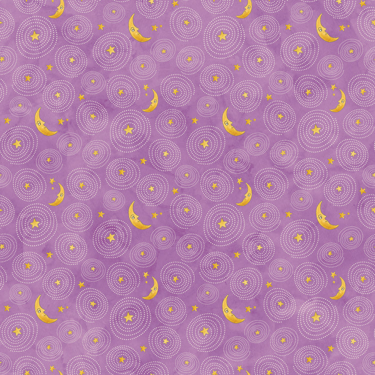 This enchanting fabric features a whimsical design of stars and crescent moons scattered across a dreamy purple background, creating a magical night sky effect. The pattern is composed of small, delicate white stars forming circular patterns around larger yellow stars and moons, giving it a playful yet serene aesthetic perfect for creating cozy, imaginative projects.