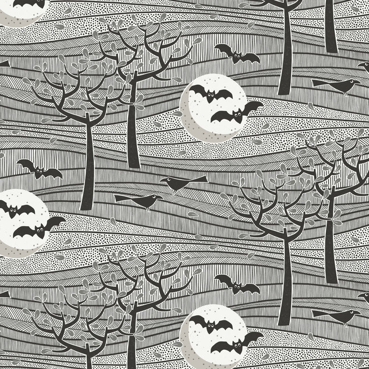 This striking landscape print features bare trees, flying bats, and glowing moons set against a field of textured, hand-drawn lines. The limited palette of black and grey enhances the moody, folk-art style of this whimsical forest scene. Printed on organic cotton poplin (quilting weight).