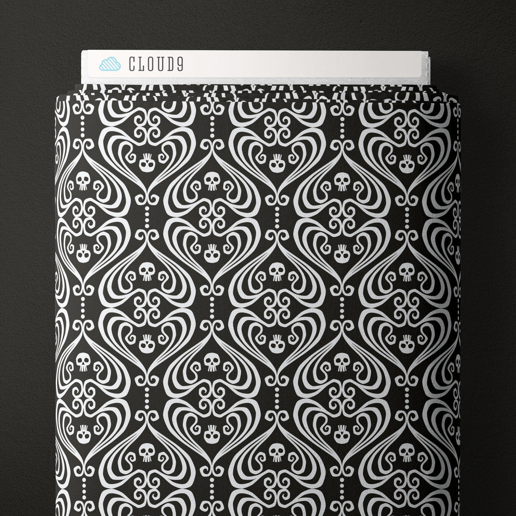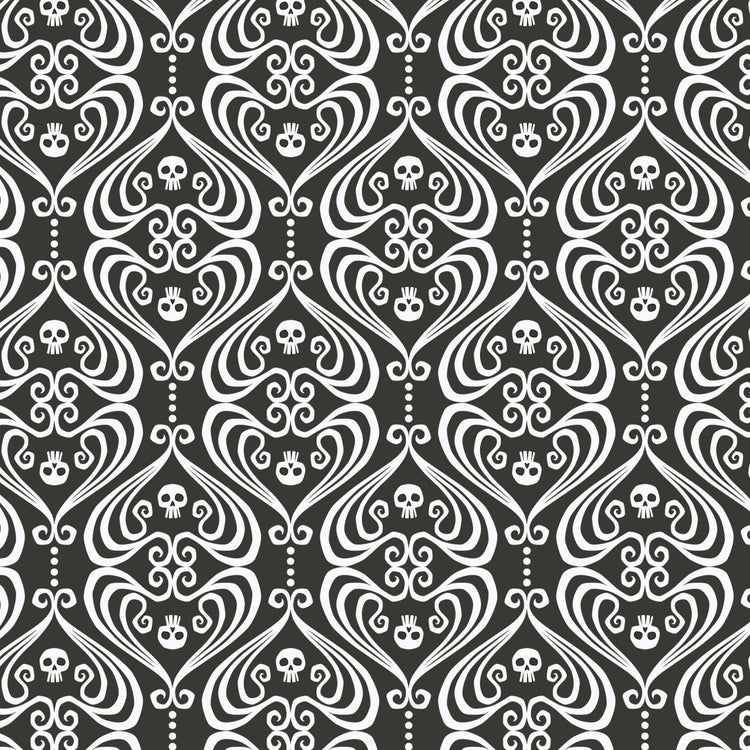 This ornate damask-style print features swirling scrolls, crowned skulls, and heart-like flourishes in a bold, high-contrast layout. With a strong gothic flair and classic black-and-white palette, it’s perfect for dramatic Halloween projects or bold quilt accents. Printed on organic cotton poplin (quilting weight).