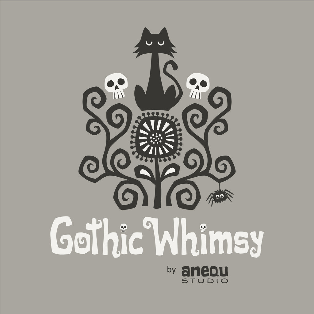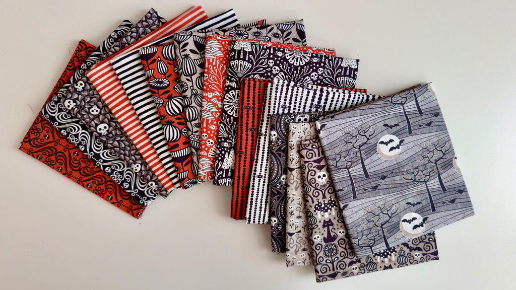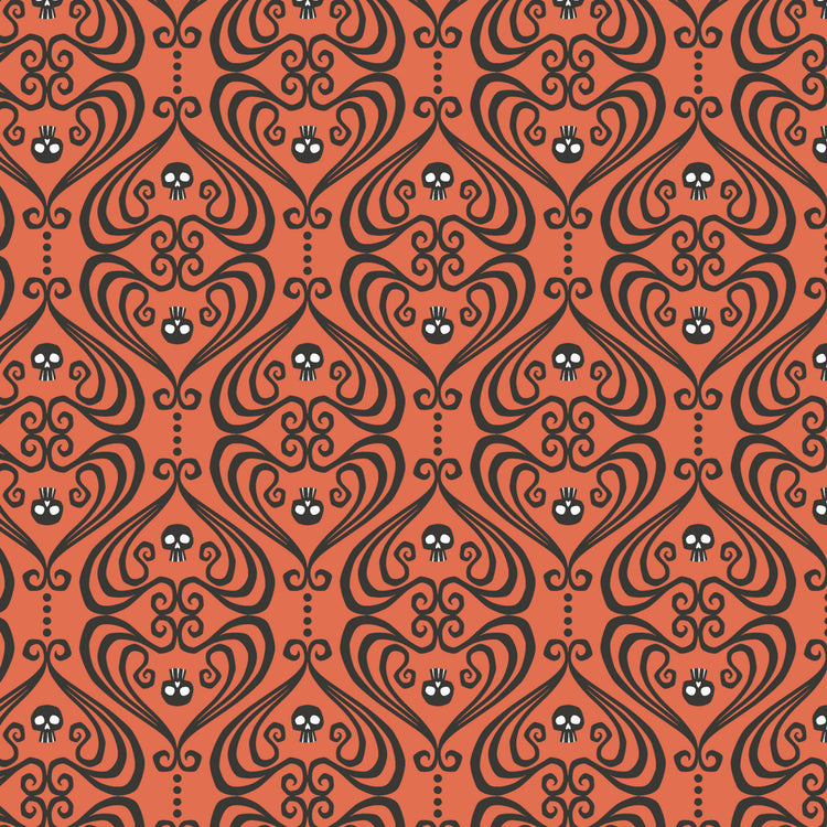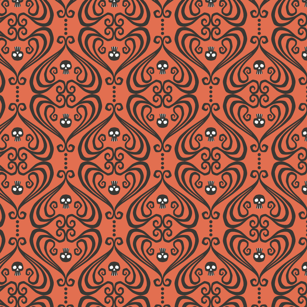 Crowned skulls and elegant scrollwork form a damask-inspired pattern in black on a vivid Halloween orange background. This bold, decorative print brings a stylish gothic twist to quilts and seasonal décor. Printed on organic cotton poplin (quilting weight).