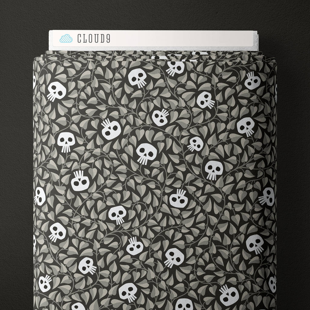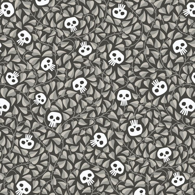 Creeping vines twist around skulls in this dense, moody tonal print. The swirling foliage and shadowy palette offer subtle texture with a gothic edge. Printed on organic cotton poplin (quilting weight).