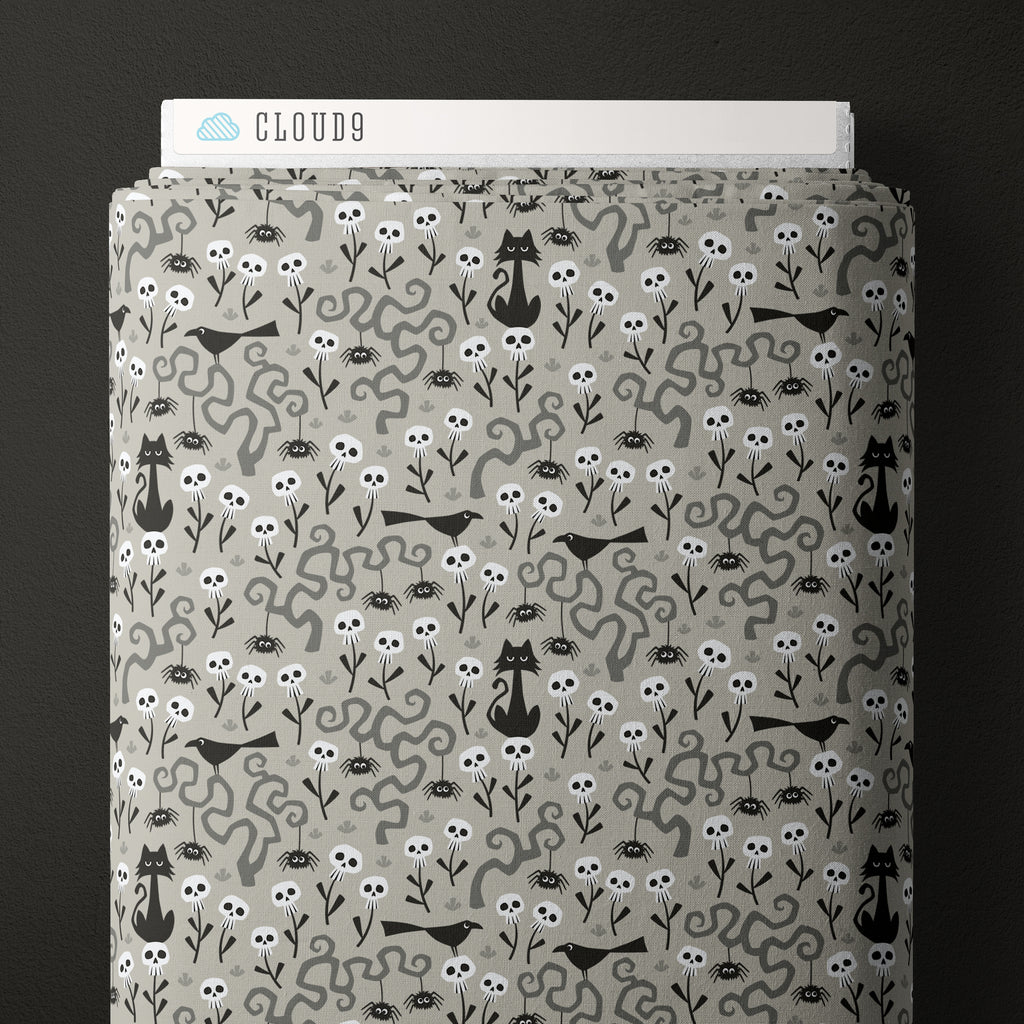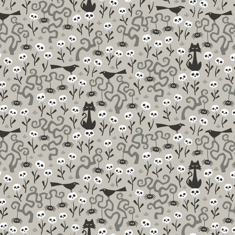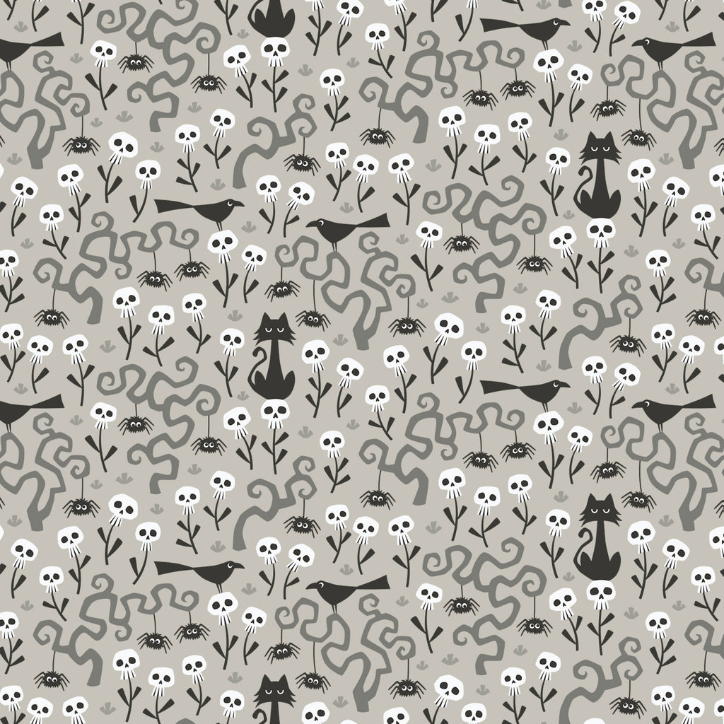Tiny skull-shaped blossoms bloom among twisting vines, curious spiders, birds, and cats. This charming small-scale print has a soft grey background and is perfect for Halloween quilting and smaller crafts. Printed on organic cotton poplin (quilting weight).