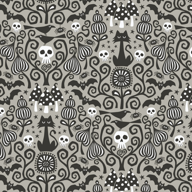 A packed and playful Halloween garden filled with black cats, pumpkins, mushrooms, skulls, and twisting vines. This richly detailed print combines folk motifs with a touch of spooky mischief in a warm, muted palette. Printed on organic cotton poplin (quilting weight).