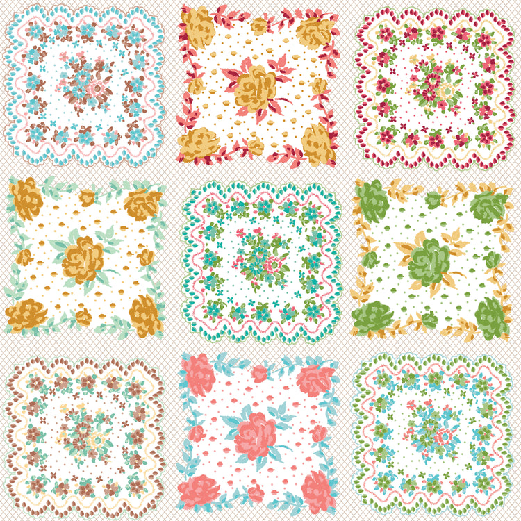 This print features vintage handkerchiefs. It's 107"/108" wide to accommodate most quilt backs.
