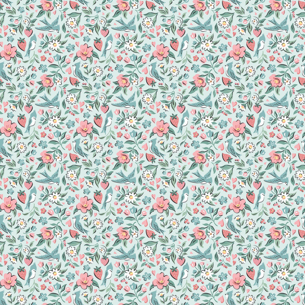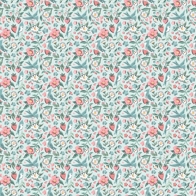 This 100% cotton print from Granny’s Sewing Room by Sheri McCulley features a charming mix of blooming florals, tiny hearts, strawberries, and playful little birds scattered across a soft blue background. The hand-drawn style gives it a nostalgic, vintage feel. It’s a sweet, versatile design that works beautifully for quilts, children’s projects, or home décor where you want a touch of whimsy and timeless cottage charm.