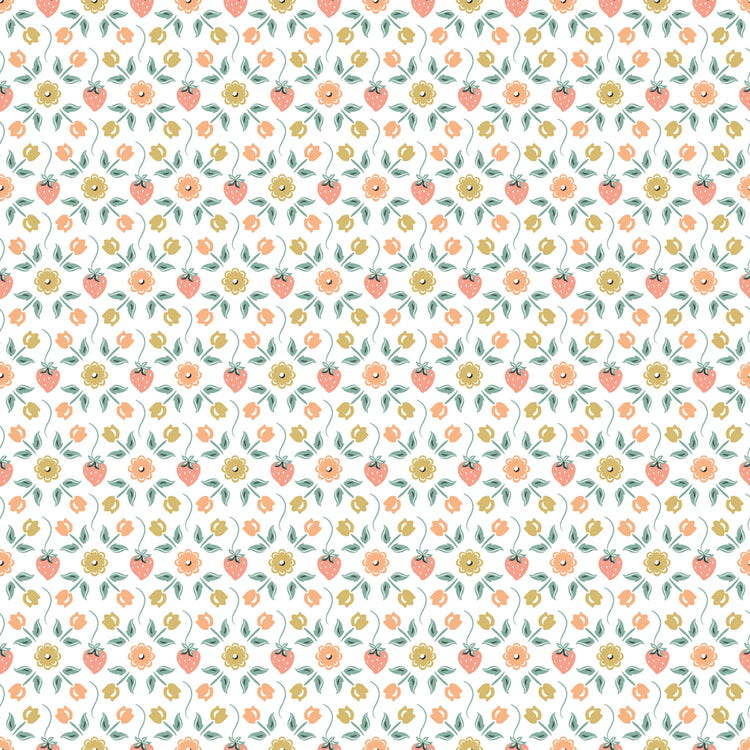 This print from Granny’s Sewing Room by Sheri McCulley for Poppie Cotton is printed on 100% cotton and features a playful tossed pattern of strawberries, blossoms, and tiny leaves in shades of coral pink, gold, and soft green against a crisp white background. The design has a charming, vintage feel while still being fresh and versatile. With its food and floral mix, it makes a sweet choice for both quilting and kitchen-inspired projects.