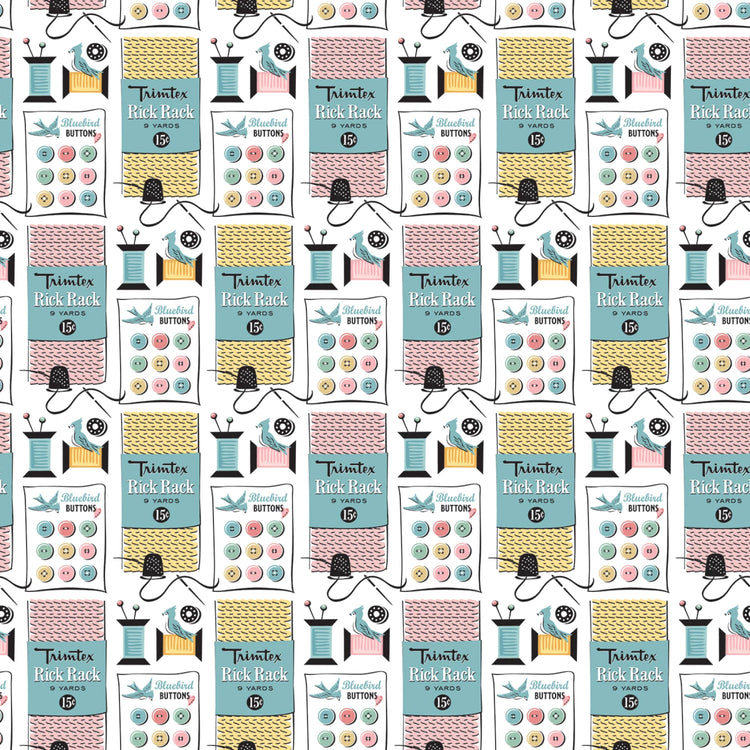 This fabric from Granny’s Sewing Room by Sheri McCulley for Poppie Cotton is printed on 100% cotton and celebrates the nostalgia of sewing notions. It features vintage-inspired button cards, spools of thread, rick rack packaging, and little sewing details in aqua, pink, yellow, and cream. The playful novelty design captures the charm of a well-loved sewing box and is perfect for themed quilting projects.