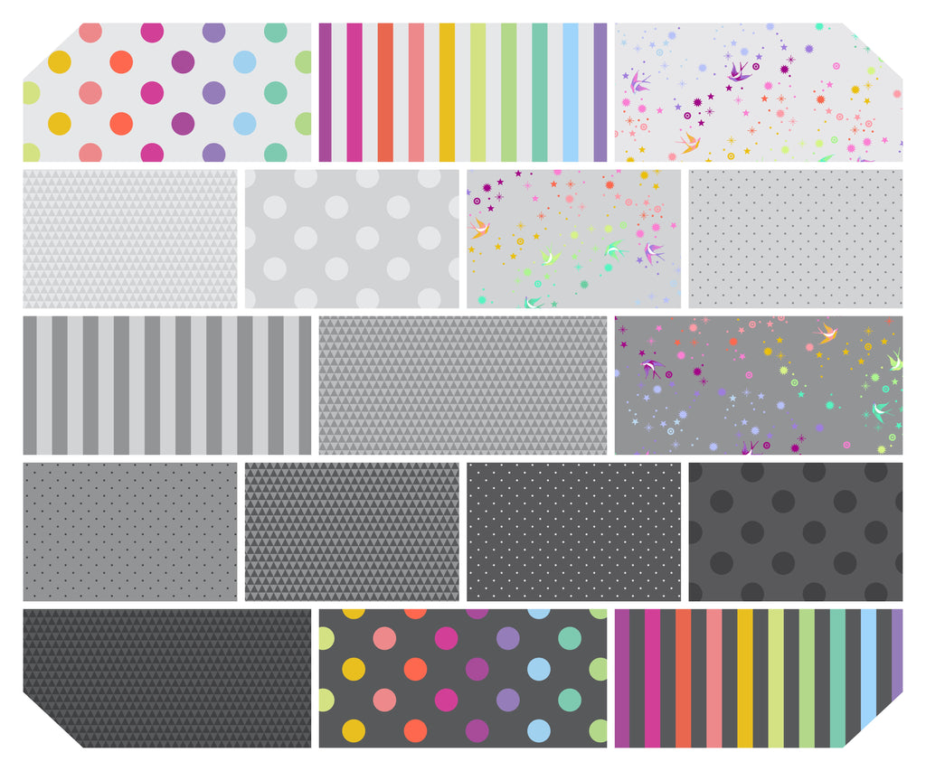 This mini charm pack features a curated selection of 2.5" × 2.5" squares from Tula Pink’s True Colors Graywork palette, offering a versatile mix of tonal dots, stripes, and small-scale prints in soft grays, charcoals, and whispers of rainbow accents. These coordinating fabrics blend beautifully with the Graywork yardage and are perfect for patchwork, charm quilts, borders, minis, pouches, and small craft projects. A great way to add pops of texture, contrast, and subtle color to any Tula-inspired design.